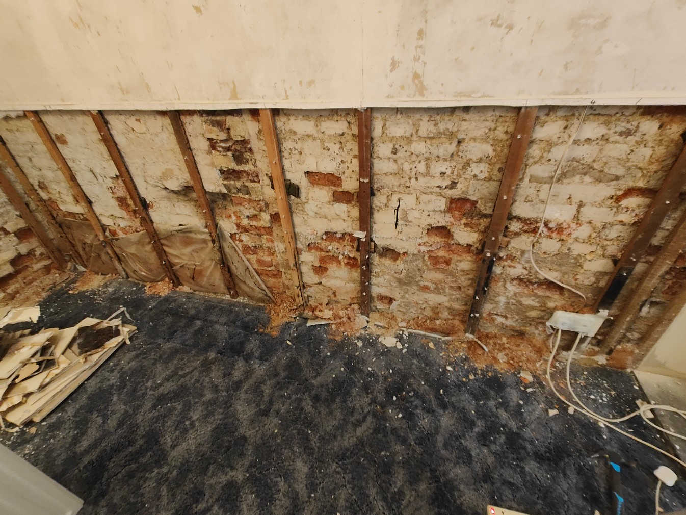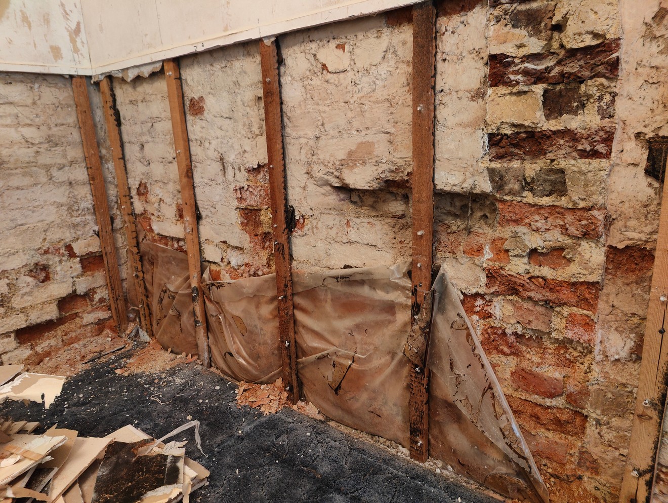 I think, from a re-read, that it's an interior wall adjoining the ex-party wall that's now retaining. So it's safe to assume that ex-party wall is very wet, and the moisture is wicking from it along this adjoining interior wall.
