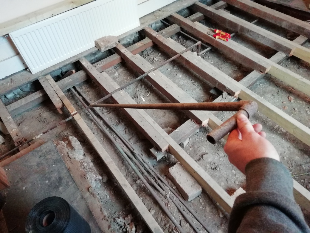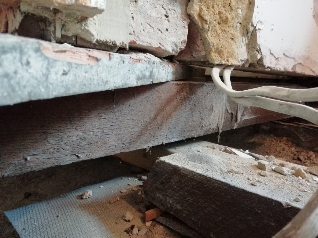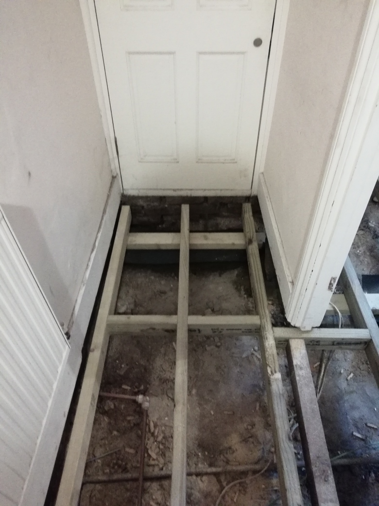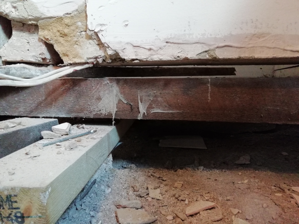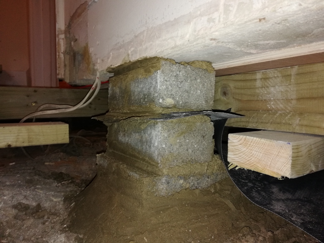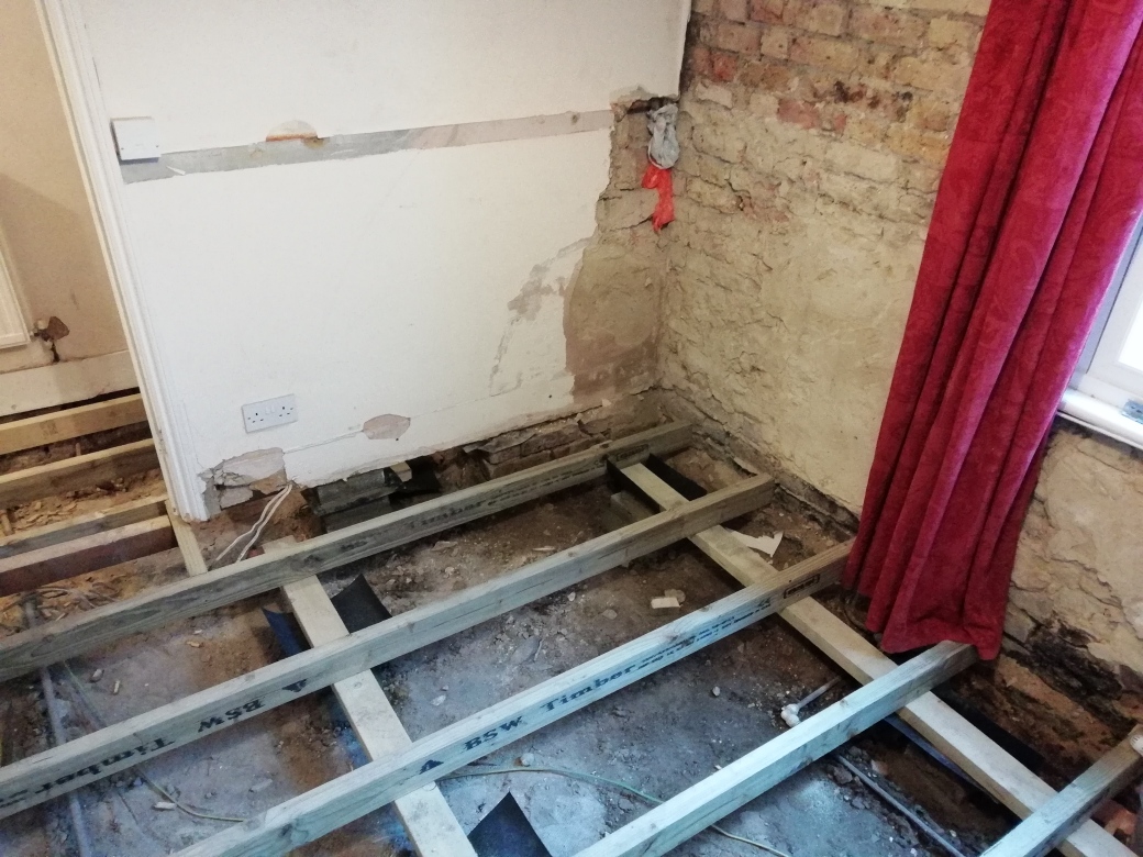 The whole floor hall and sitting room including original floor and joists were replaced with new joists, bricks to support them set in concrete and Meyer brand ply wood.