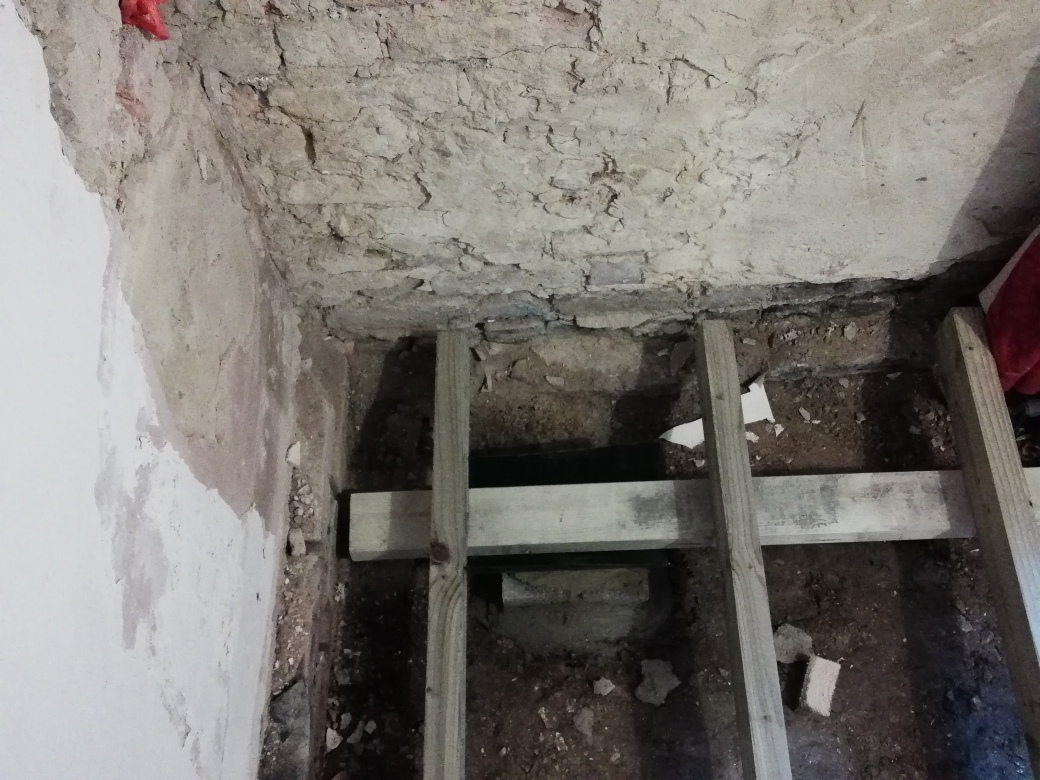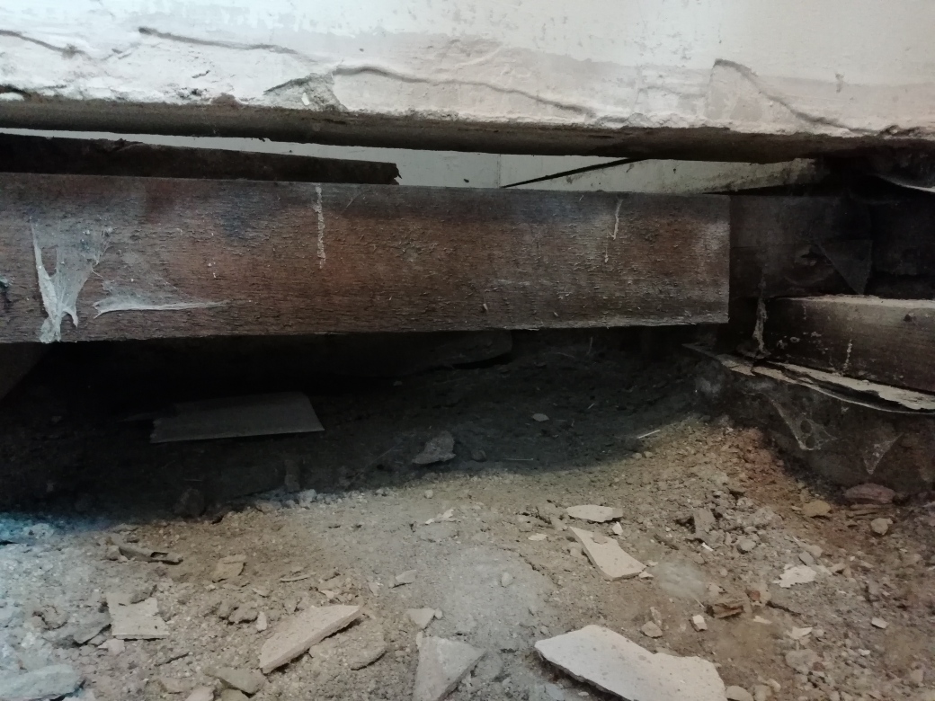 The floor joists seem to be too far apart underneath the floor and part of the Meyer brand ply flooring collapsed in the corner to the right of the chimney breast where I had furniture on.