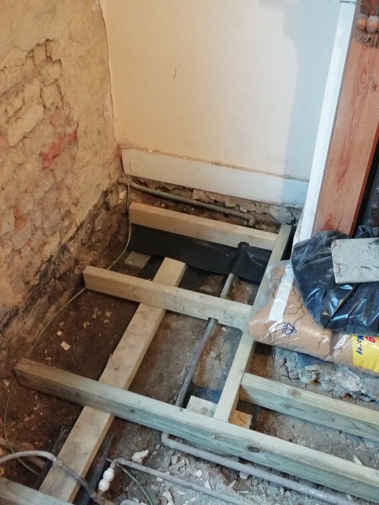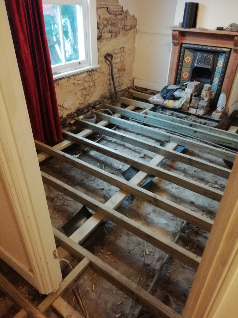 All the original floorboards rotted due to the lack of ventilation from the concrete at the front garden despite having two air bricks. Concrete was dug out and a little concrete put in the front garden for about 30cms adjacent to the sitting room wall. Air bricks have been removed and small round telescopic vents, walls replastered and floor redone.