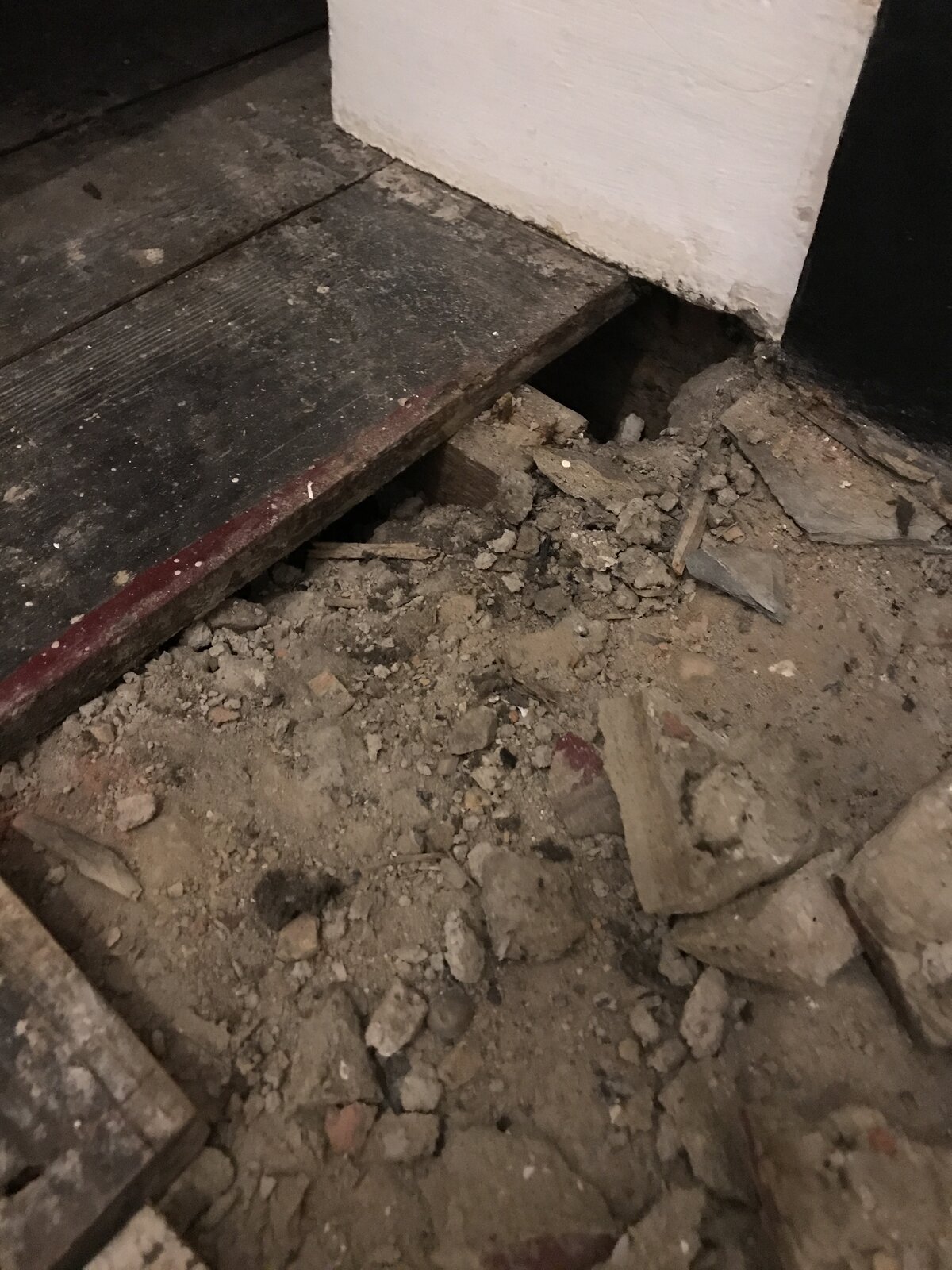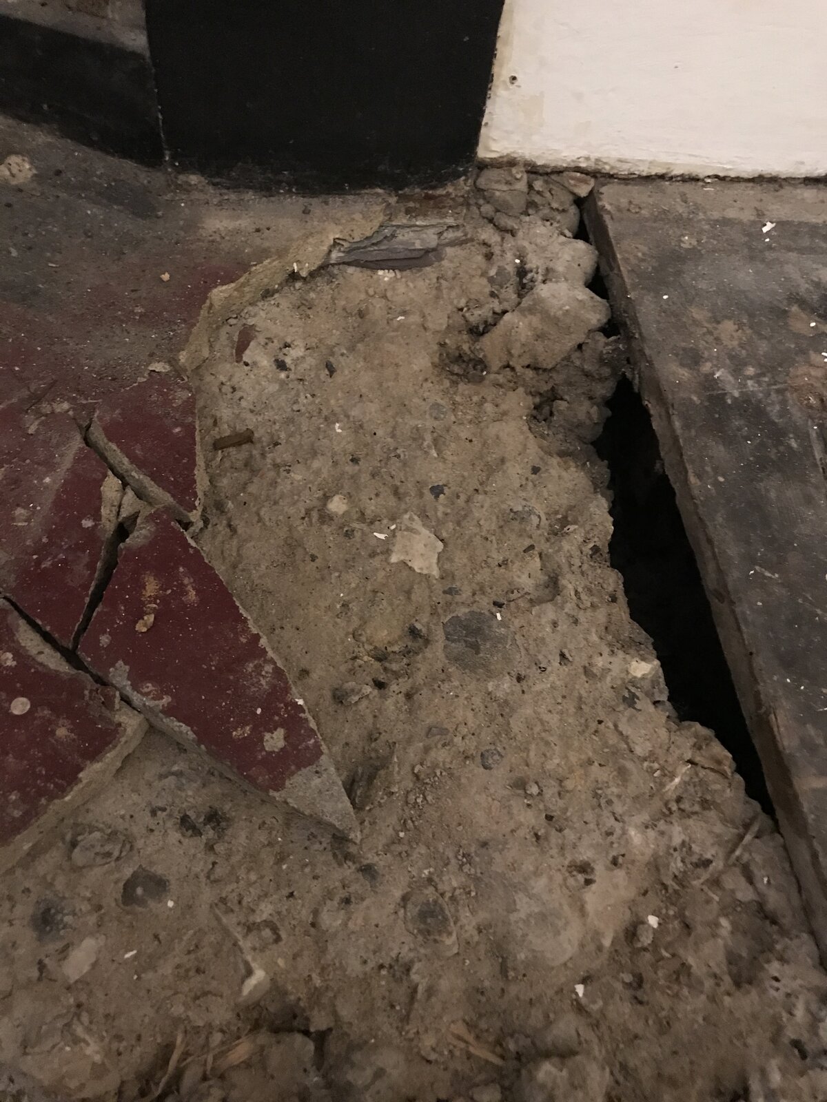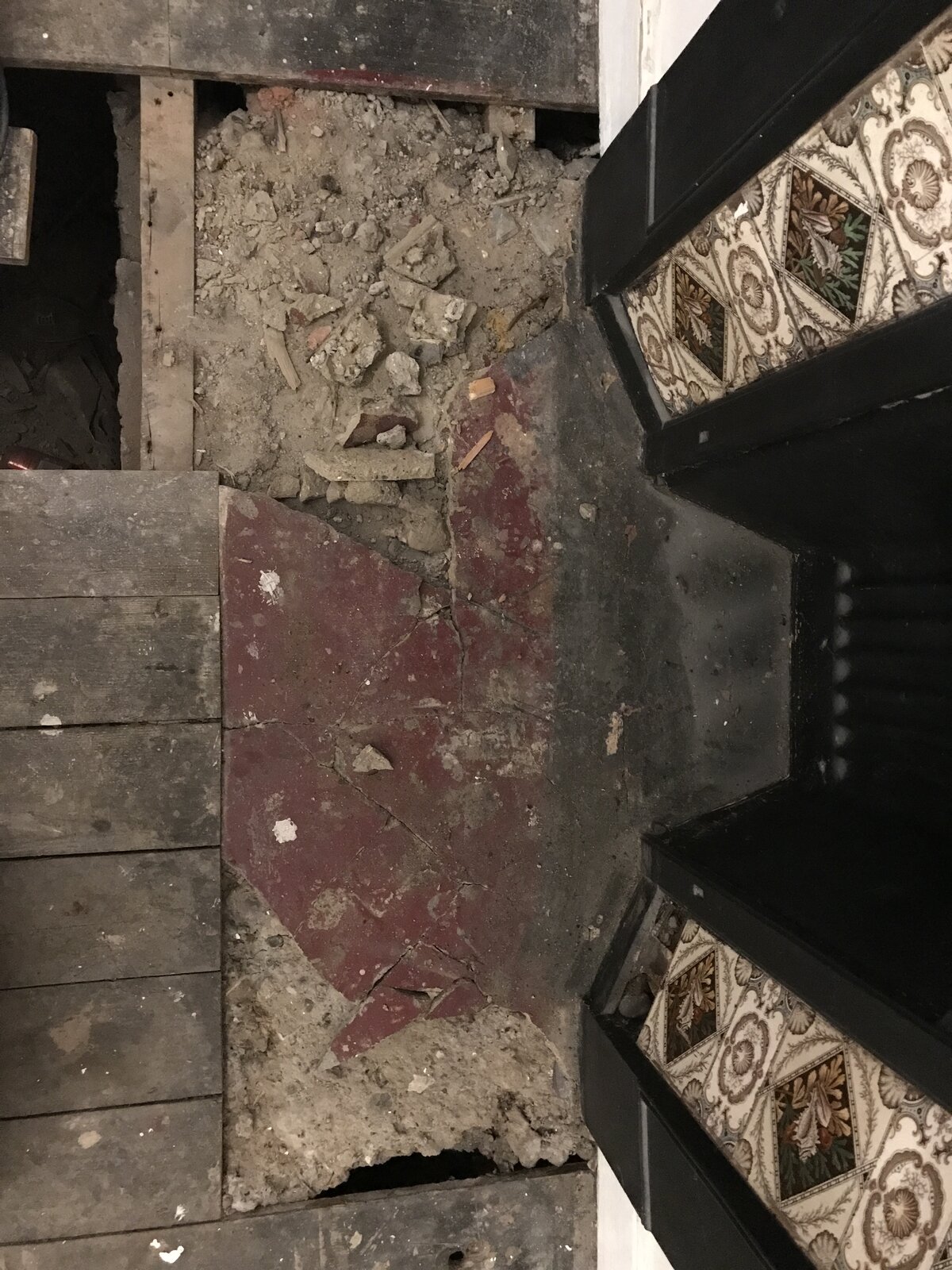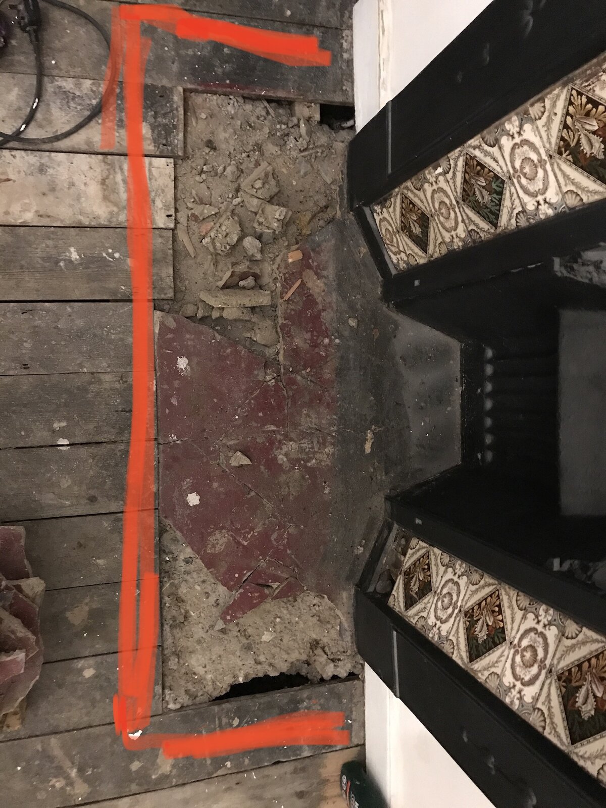 The screed was heavily cracked at the sides of the hearth where the structural cement below did not reach the joists (below the screed here was just rubble, which I have pulled out). It's as if the cement was poured in but didn't reach the sides). I've since pulled up a bit more of the screed, as visible in the pictures.