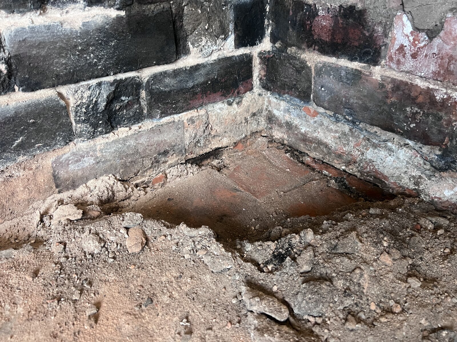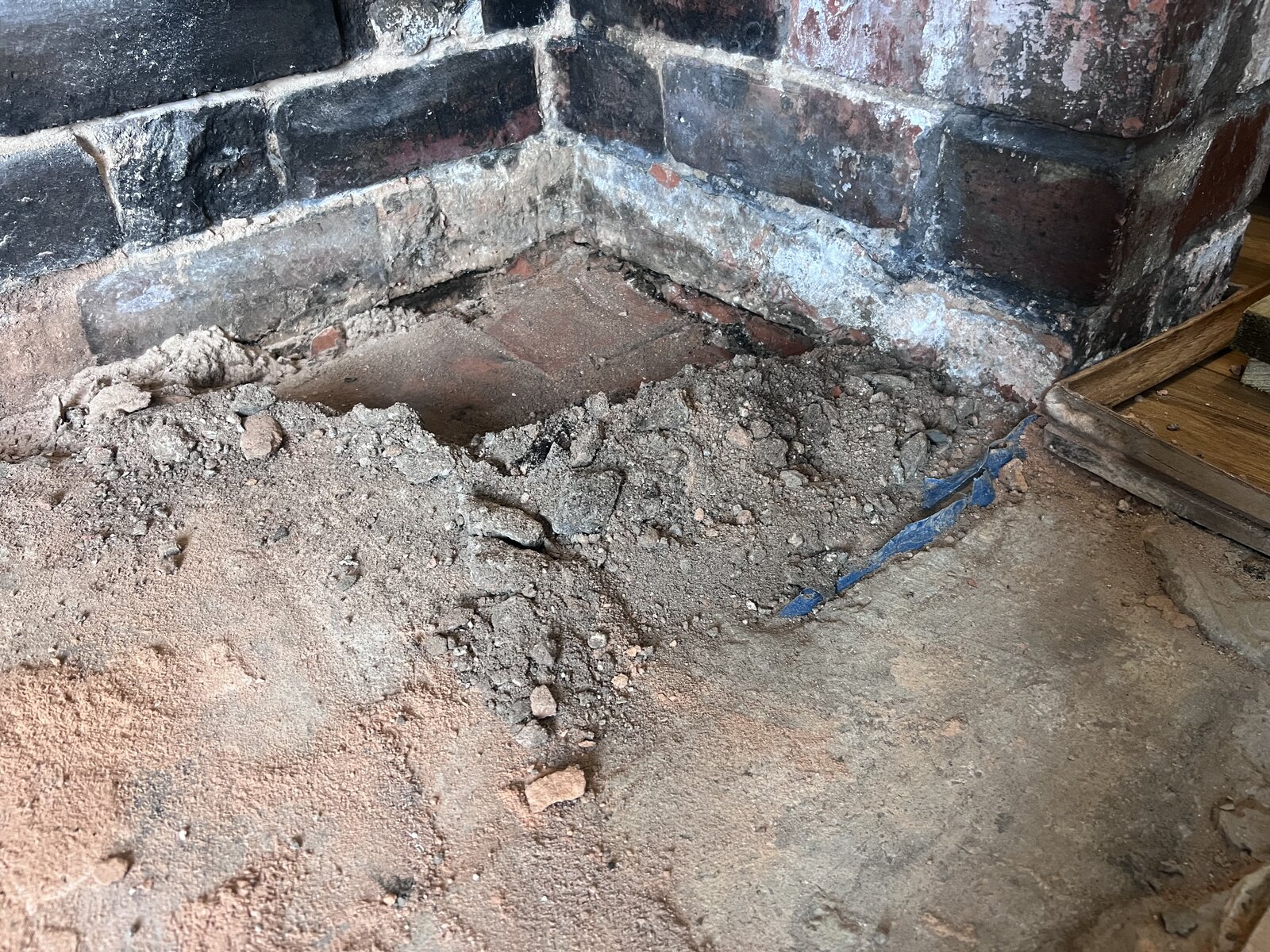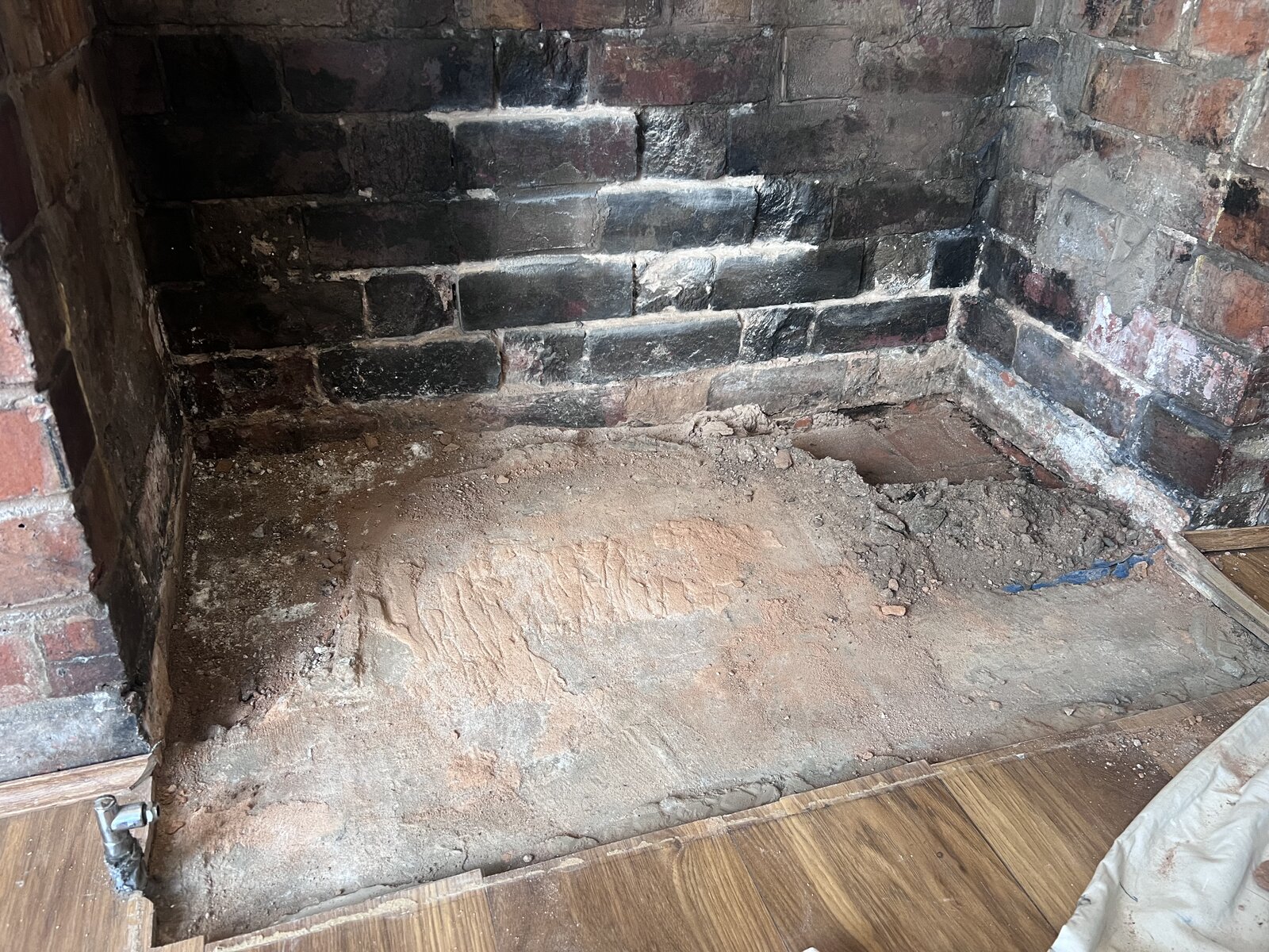 As you can see the hearth had a 25% mix of original ash dirt subfloor left behind and then a newer self level screed which only fills half the hearth.