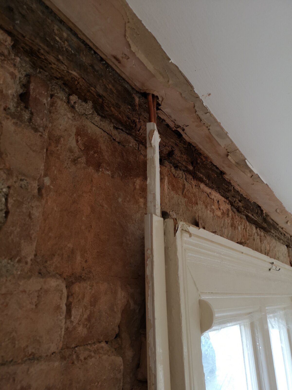 The main issue is at the very top of the external wall on the ground floor, there is a wooden beam running the length of the house which is supporting the floor joists above. This is rotten, in some places it is compost, the floor joists above are also rotten in places.