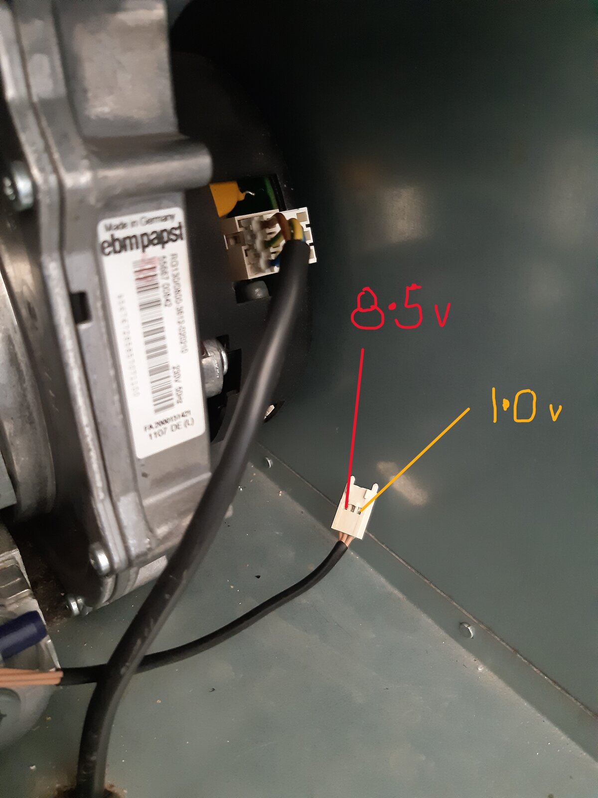 The main fan connector is seeing 240v but the small 3 wire connector is reading 8.5v and 1.0v measured between each outer terminal and the centre. See photo attached.