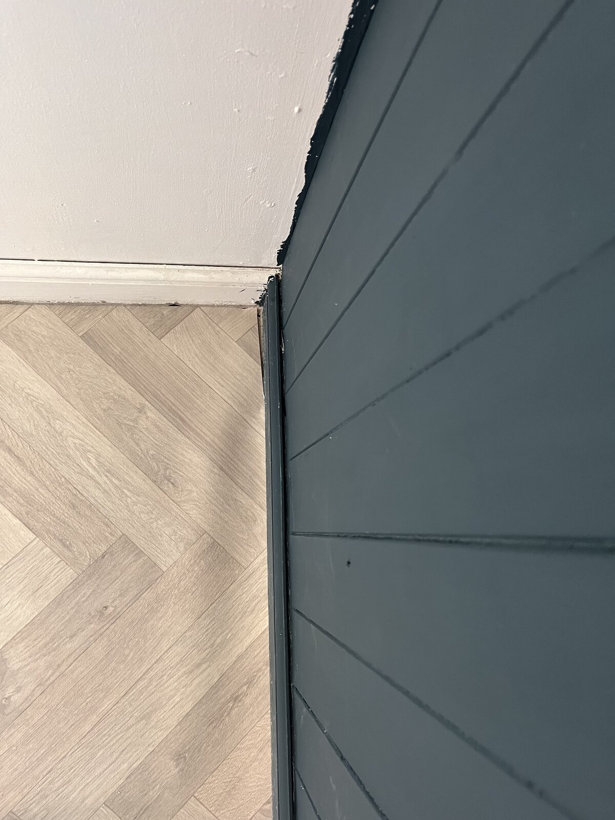 Some corners etc are splits coming out,pattern not matching up on join,and out of square by 30mm per 6ft run so the herringbone not parallel to wall.