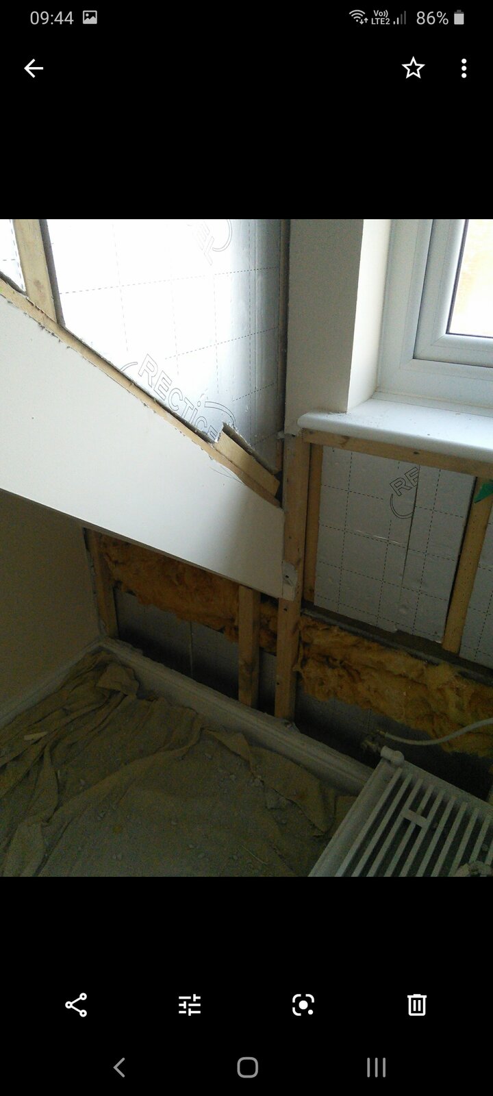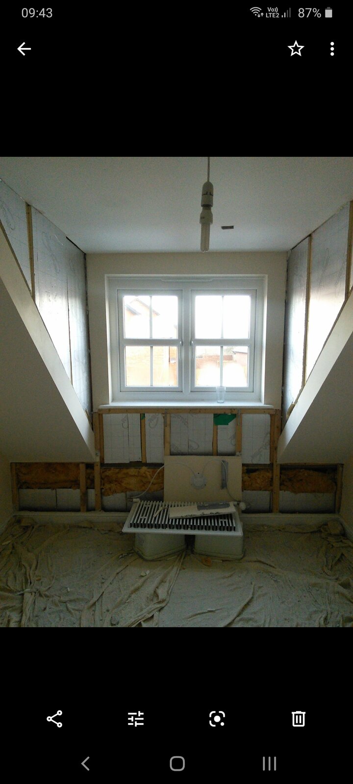 Our dormer window bedroom is cold with these walls being very cold. After removing the plasterboard, this is what is behind. A mixture of loft insulation stuffed into the RSJ and Kingspan.