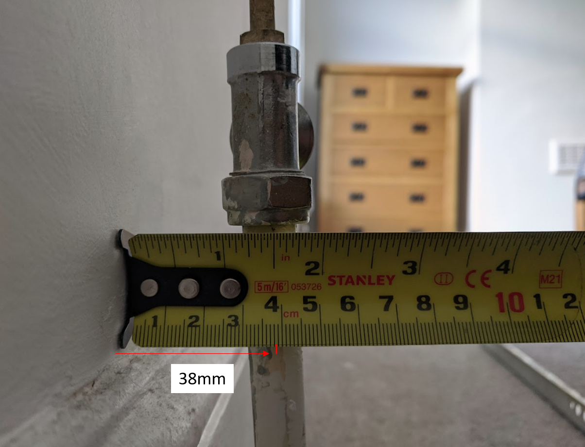 My wall to pipe centre measurement is 38mm (see image).
