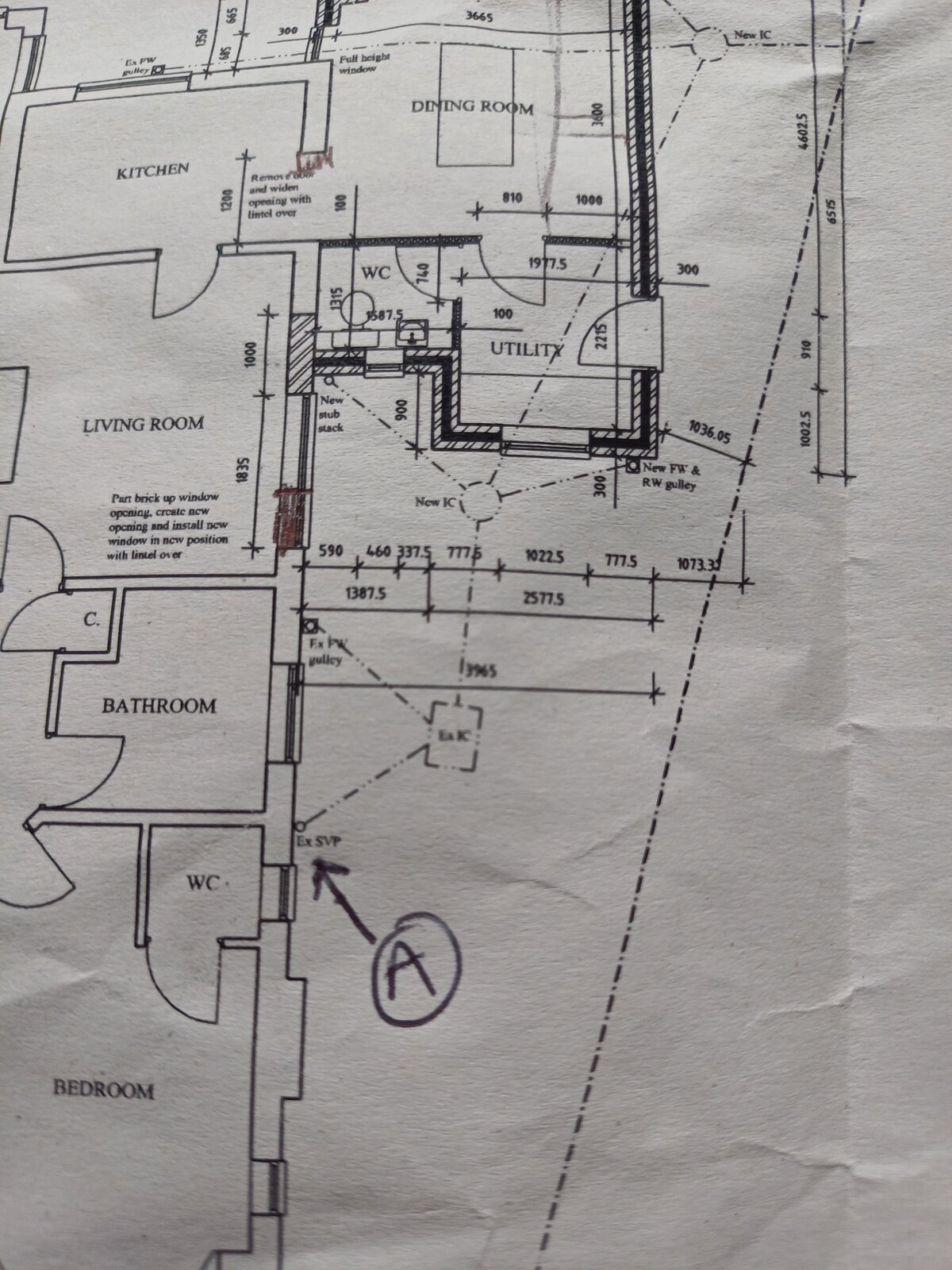 If you look at where I've marked 'A' in a circle, that is an existing soil pipe with a passive vent on the top, above eaves level. It is connected to two toilets which are located on the other side of the wall from it.