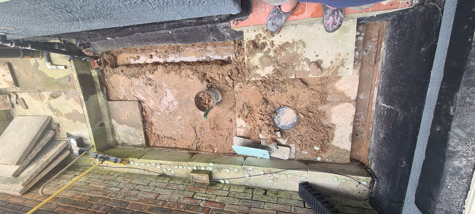 I decided to take up the slabs and there was puddles of water underneath them and what appears to be clay bed, i have dug a trench around the outside and planning installing aco drains, the gully is currently too high, is this easy to take out and replace or would you suggest something different?