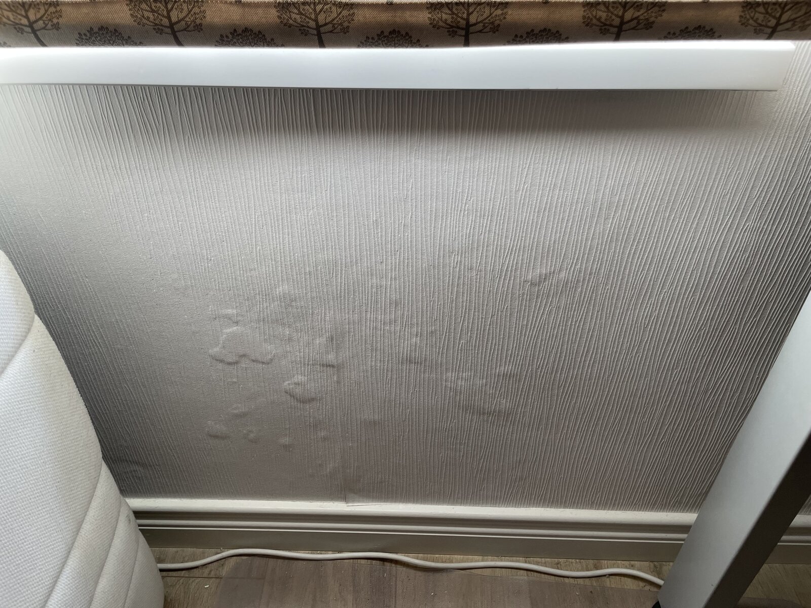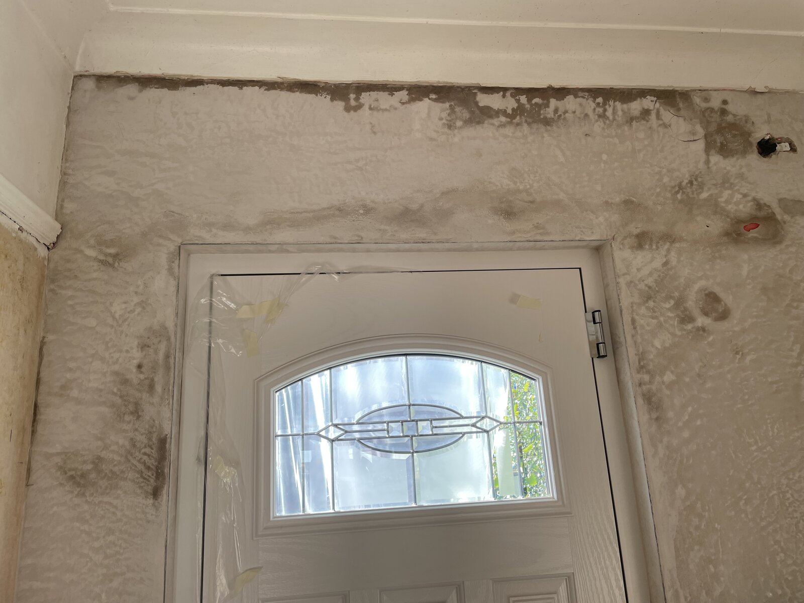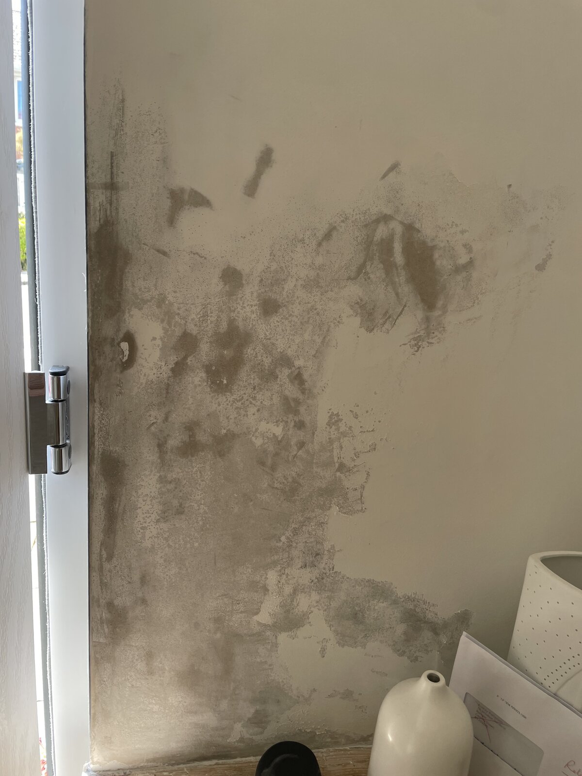 plaster below the window in the study was powdery and blown in patches when I moved in two years ago, which I naively sanded and wallpapered over, not realising at the time that there was a bigger Issue. Directly below the study is my front hall and between the ceiling in the hall and the top of my front door and part of the side of the door there is large patch of efflorescence and the plaster feels blown in some areas. I have removed the sealant from the upstairs window outside (where pvc frame meets brick) and resealed as there was a few noticeable holes in the sealant at the bottom. This helped a bit and the wall