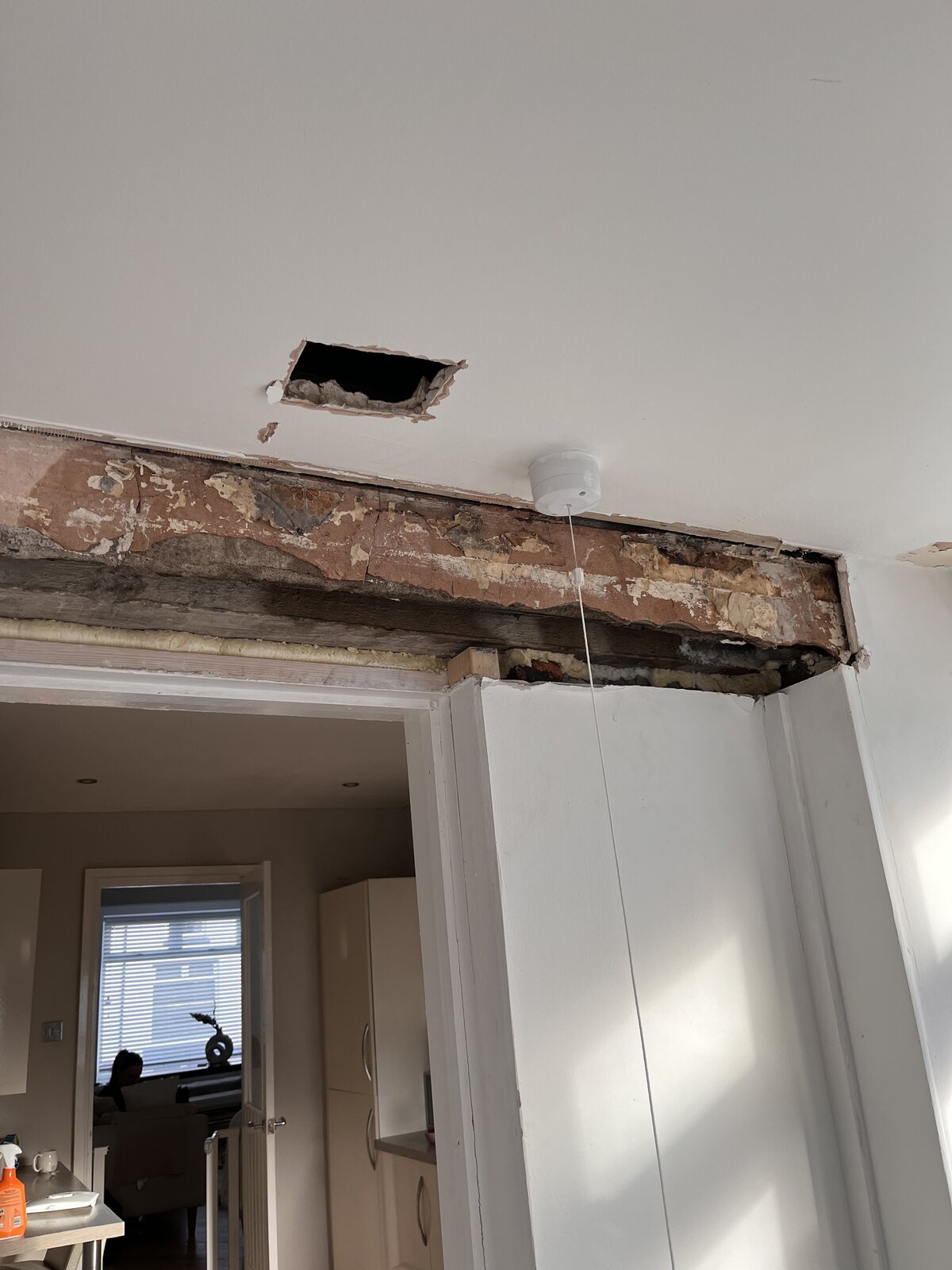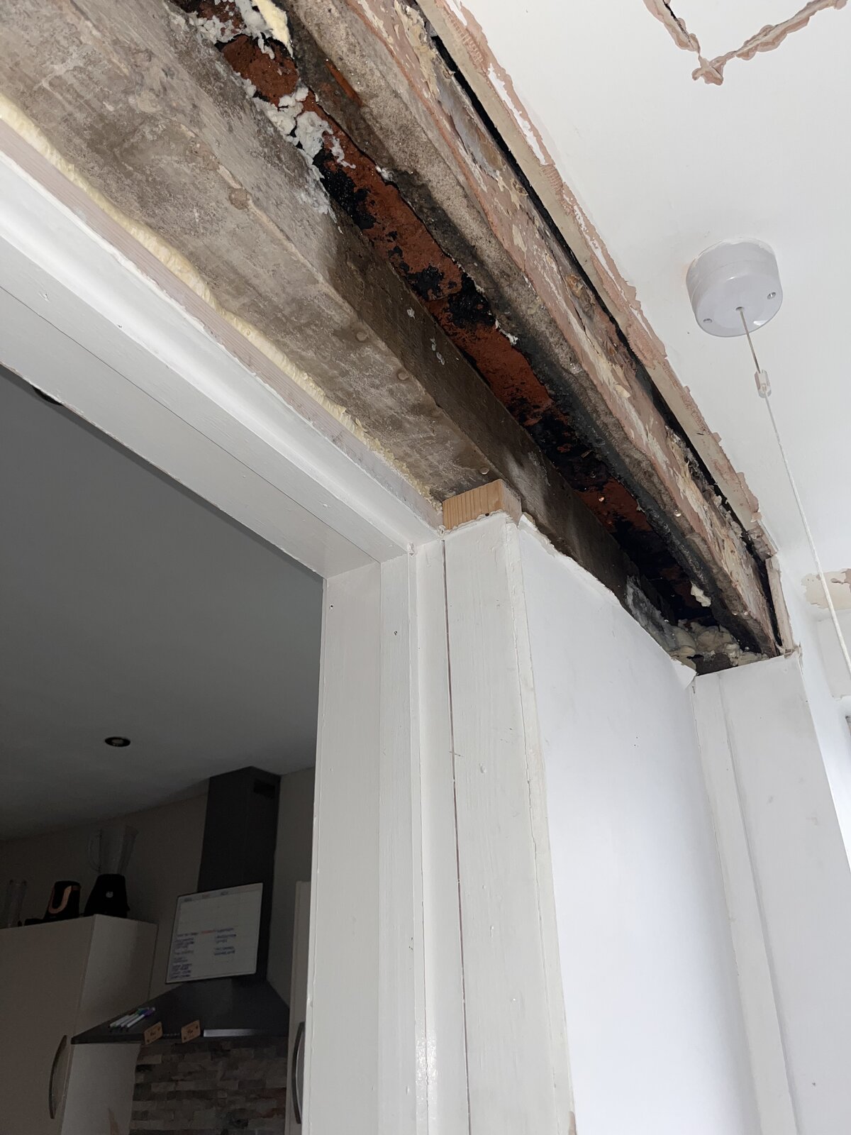 This is what is confusing me, upstairs as you can see from the photos it looks like a cavity wall because I can see the inner and out leafy brick work. But when I come downstairs I can’t see the cavity because there’s bricks over the lintel?