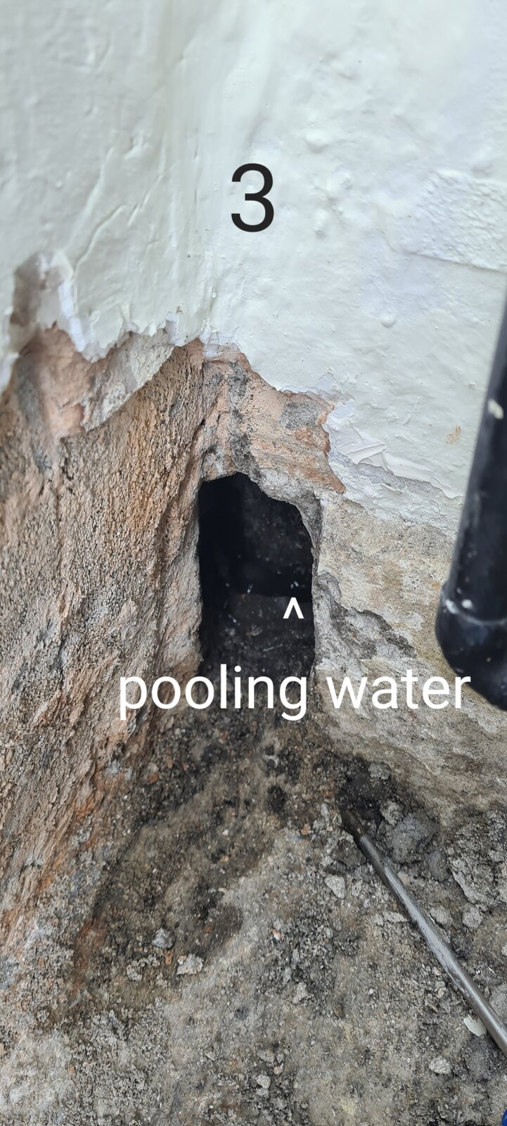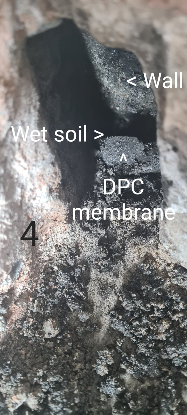 Photos 3 and 4 show the corner of the room where the DCP membrane us short and doesn't reach the corner and retaining wall.
