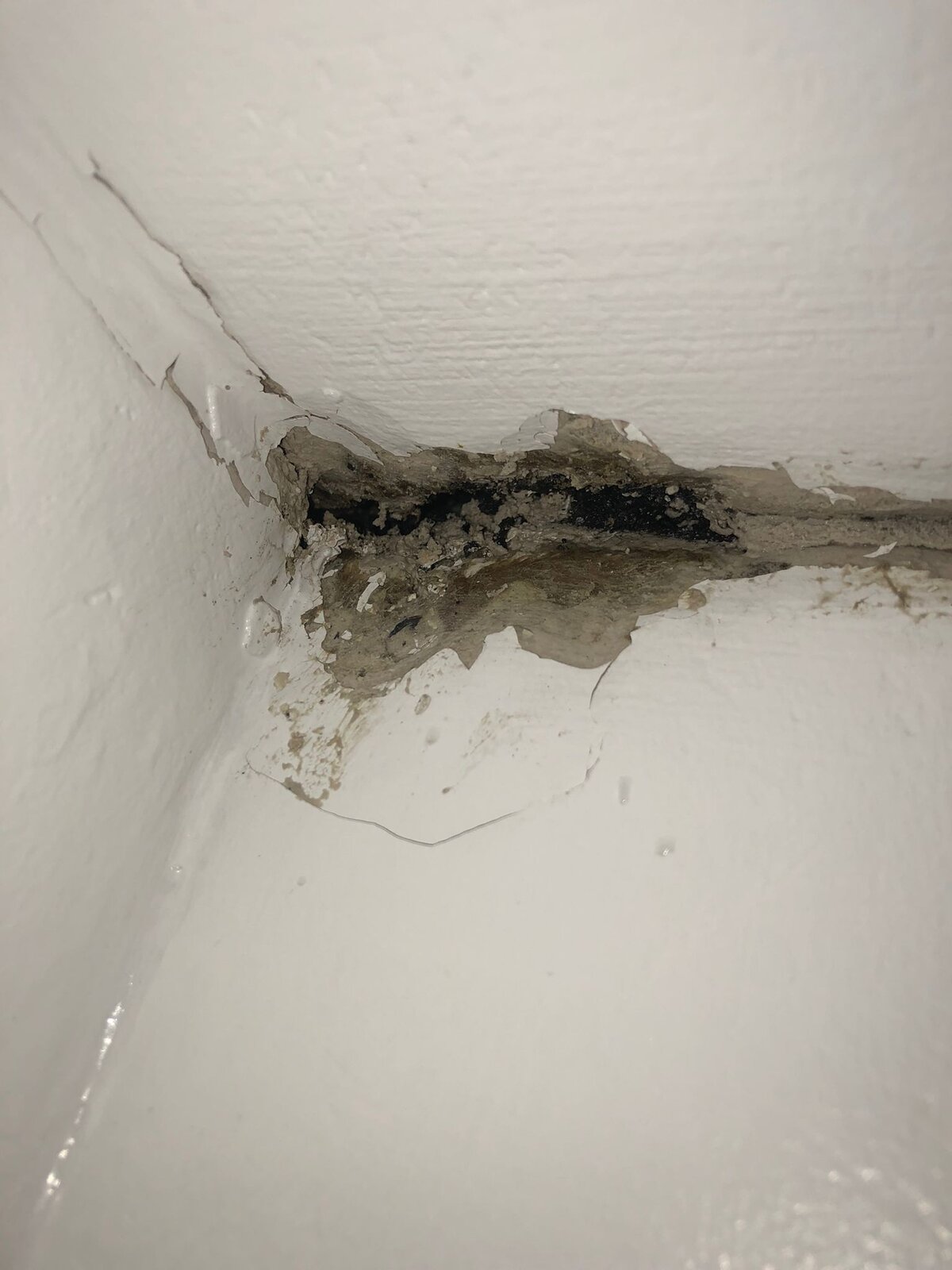 New house and the top floor corner wall was soft to touch and being curious I pulled away at it and found a small hole directly going into the loft. Went up there and found patches and marks around extractor fan and looks like the plasterboard has water damage.