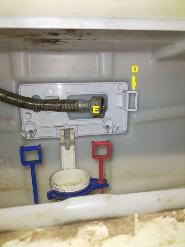 When I turn the water on when the water pipe it is not attached to the unit, the water comes out fine (E on second pic), but when attached to the unit it stops, and the cistern does not refill.