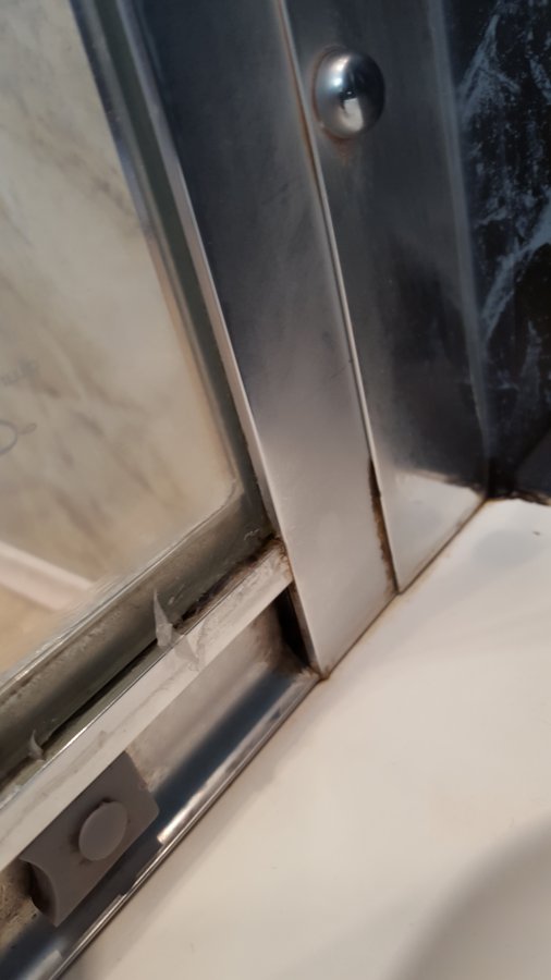 In the picture...where the dark shadowy hole at the shower trackis im 100% sure (by doing water tests) that water is going in there and somehow escaping outside the shower enclosure and coming out onto the floor outside while showering