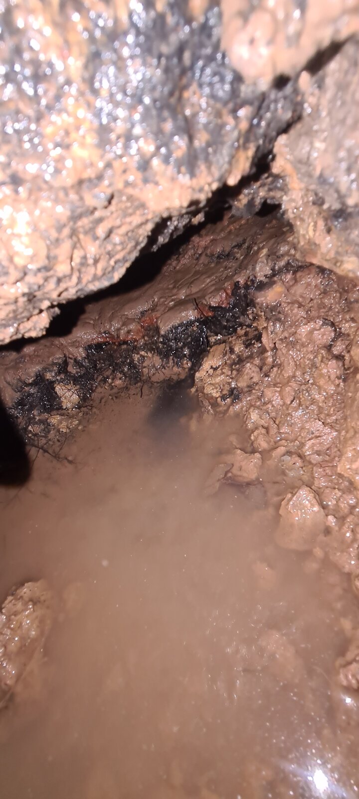 When the water leaks through and after filming under the wall I've noticed how hollow it seems behind and all this black stuff trickles through and is on the bottom of the foundation, what is this? The water stain on the wall i thought could be built up sitting water the other side as its been drying out a bit with how much ive been emptying water however, the soil from my garden before the drive came to that line so its hard to determine if its just drying out now it's seen daylight for the first time in 20+years