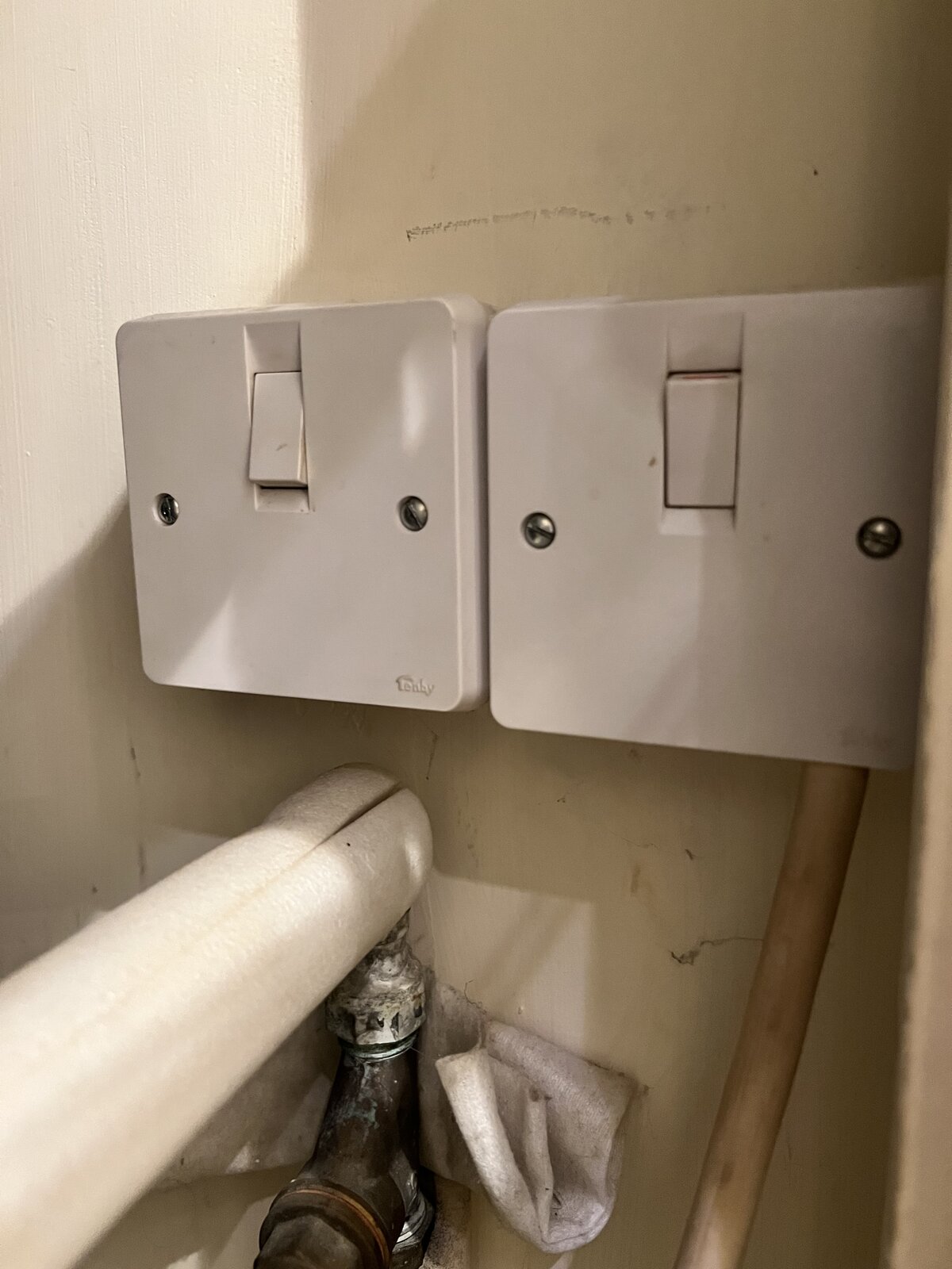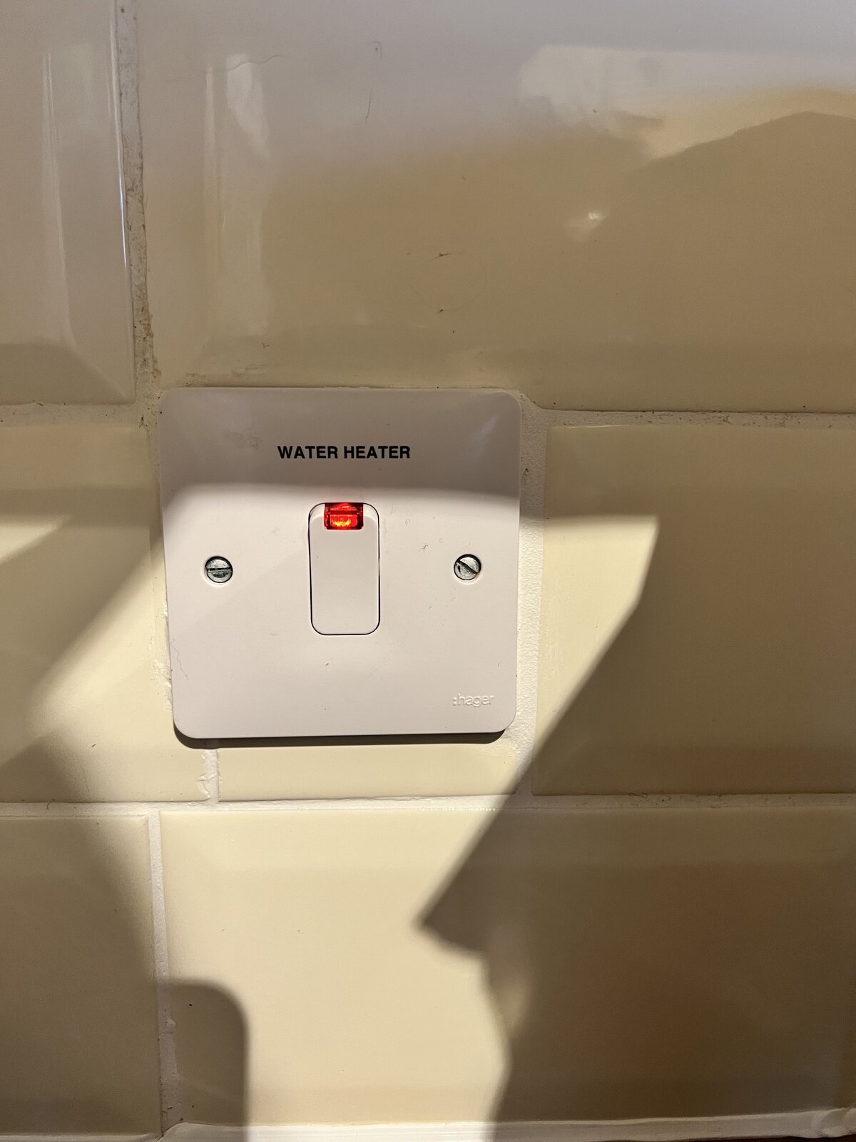 There is also a switch in the kitchen with a label that says "Water Heater" with a light on it. I have no idea what this does either in relation to the other two switches, and when the two switches in the cupboard are turned off, the light stays on.