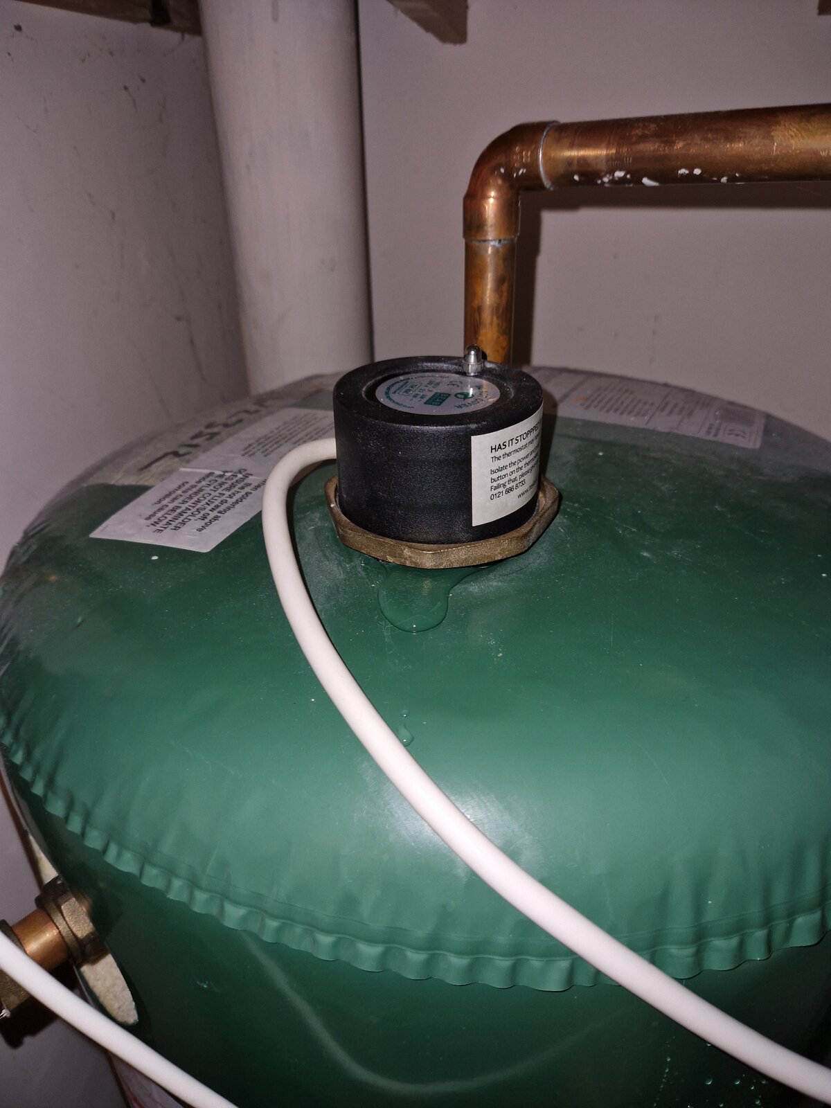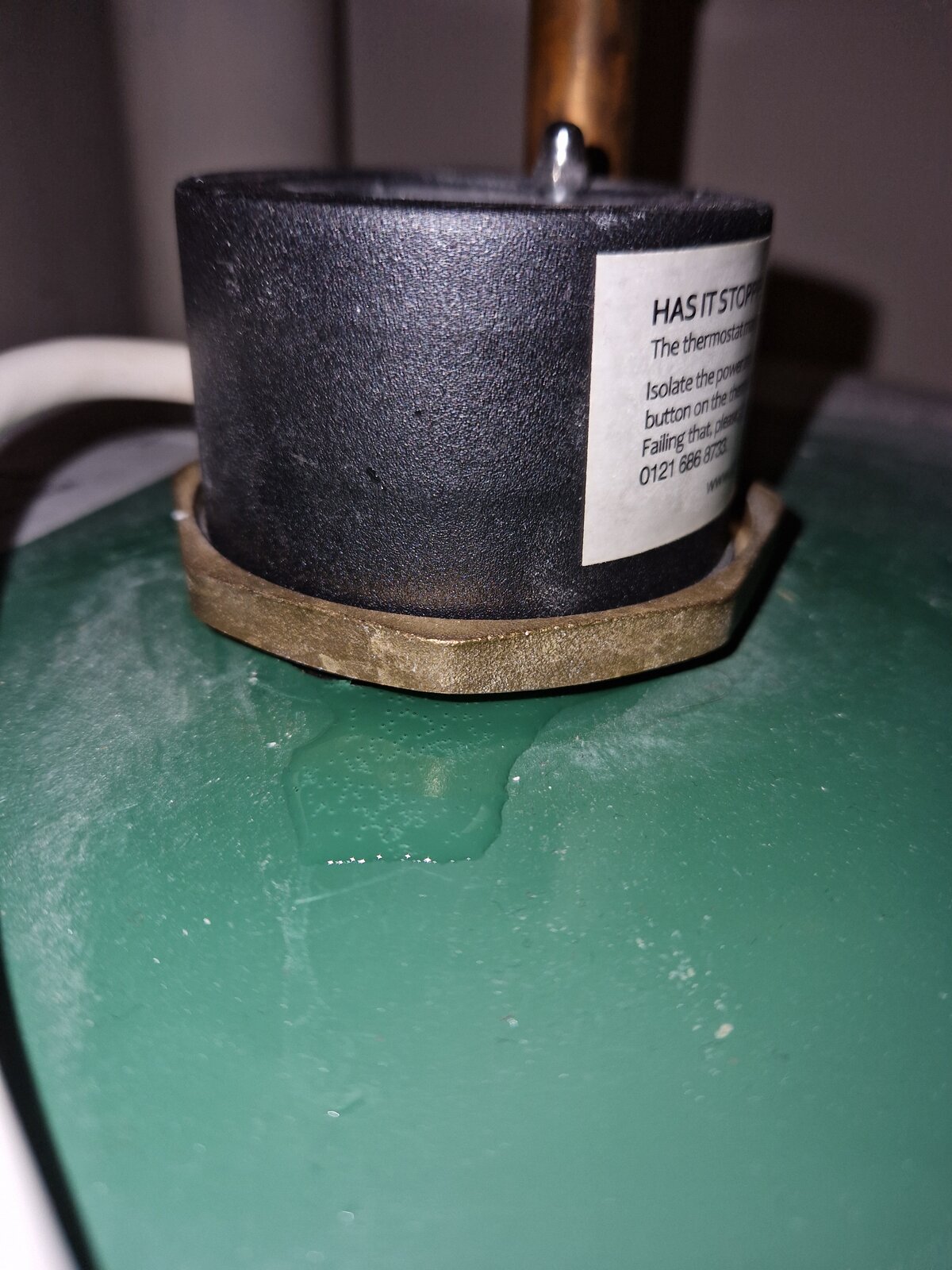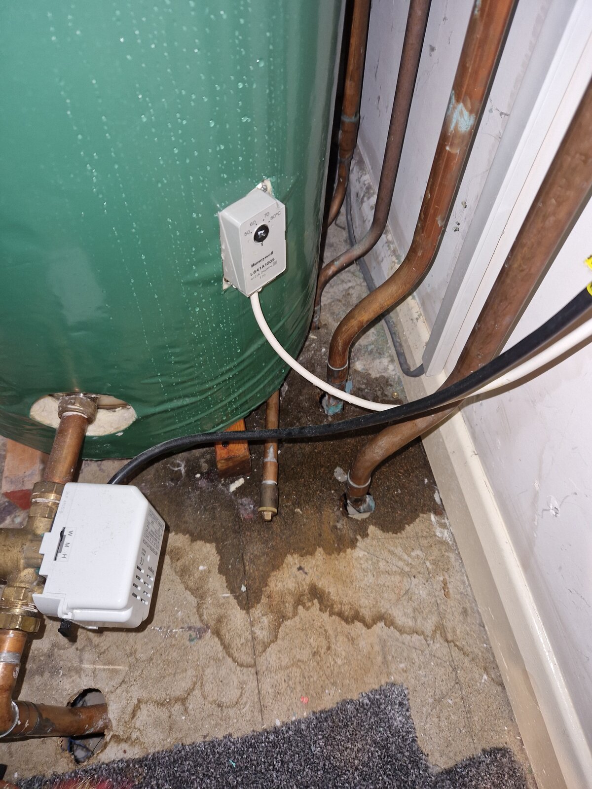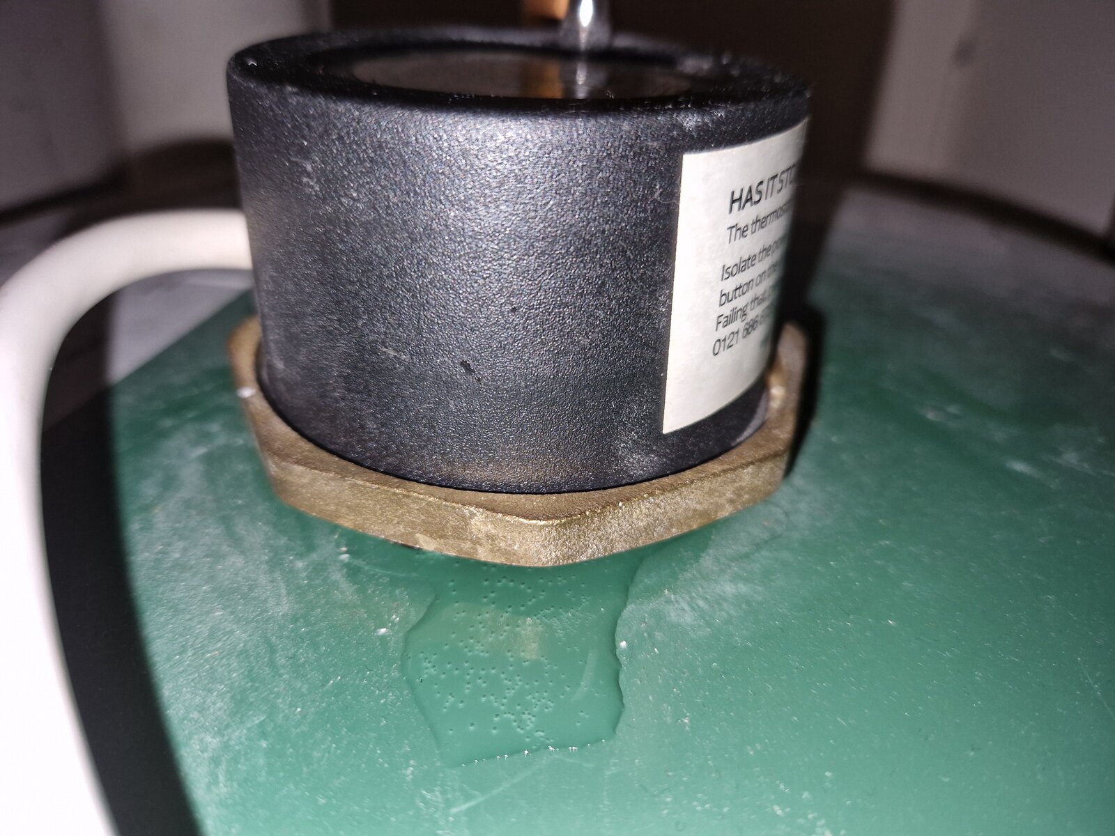 Hi noticed a brown stain on front room ceiling and after looking in airing cupboard there appears to be a small water leak coming from the top of the water cylinder. Have attached pictures. What could be causing this ?
