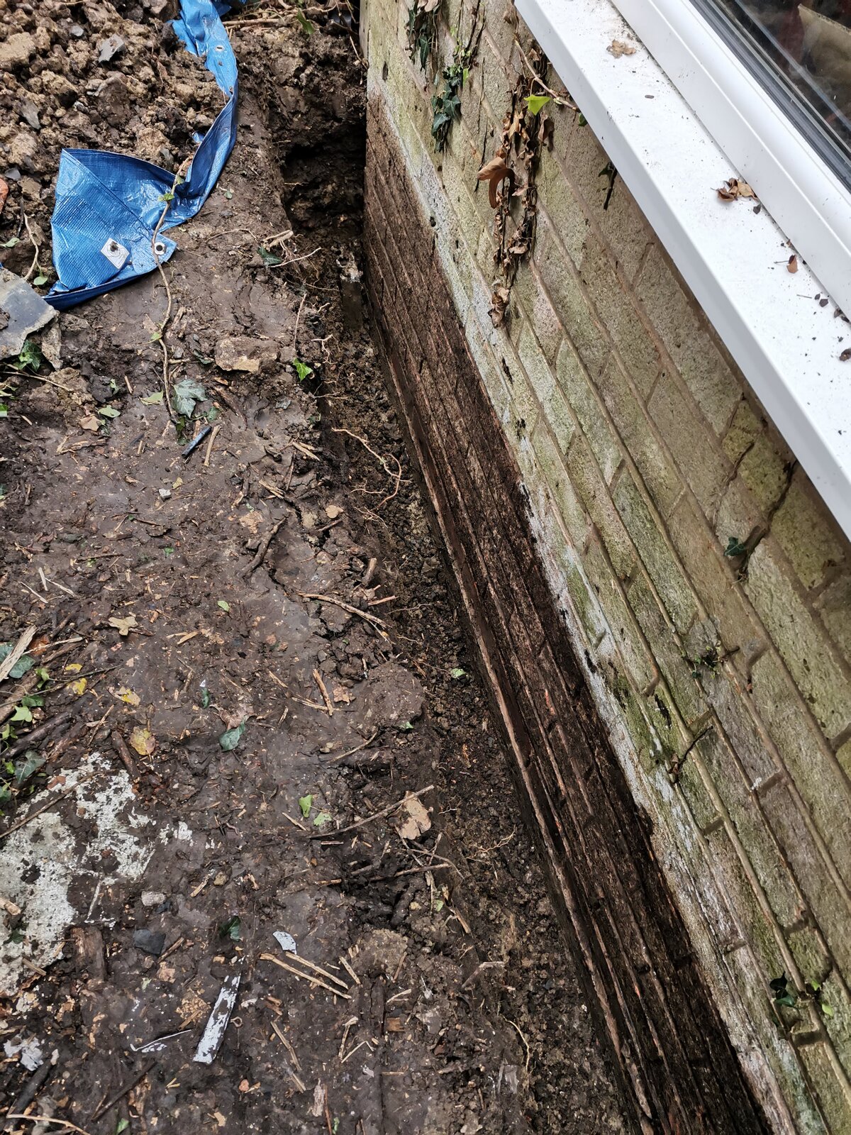 I have long going dampness issue on one of my garage wall as big part of it is under the ground level as it makes border with my neighbour who has his ground level higher then me. I have finally managed to dig a trench around the wall in my neighbour garden and now I need to seal it, and would greatly appreciate any advice on that.