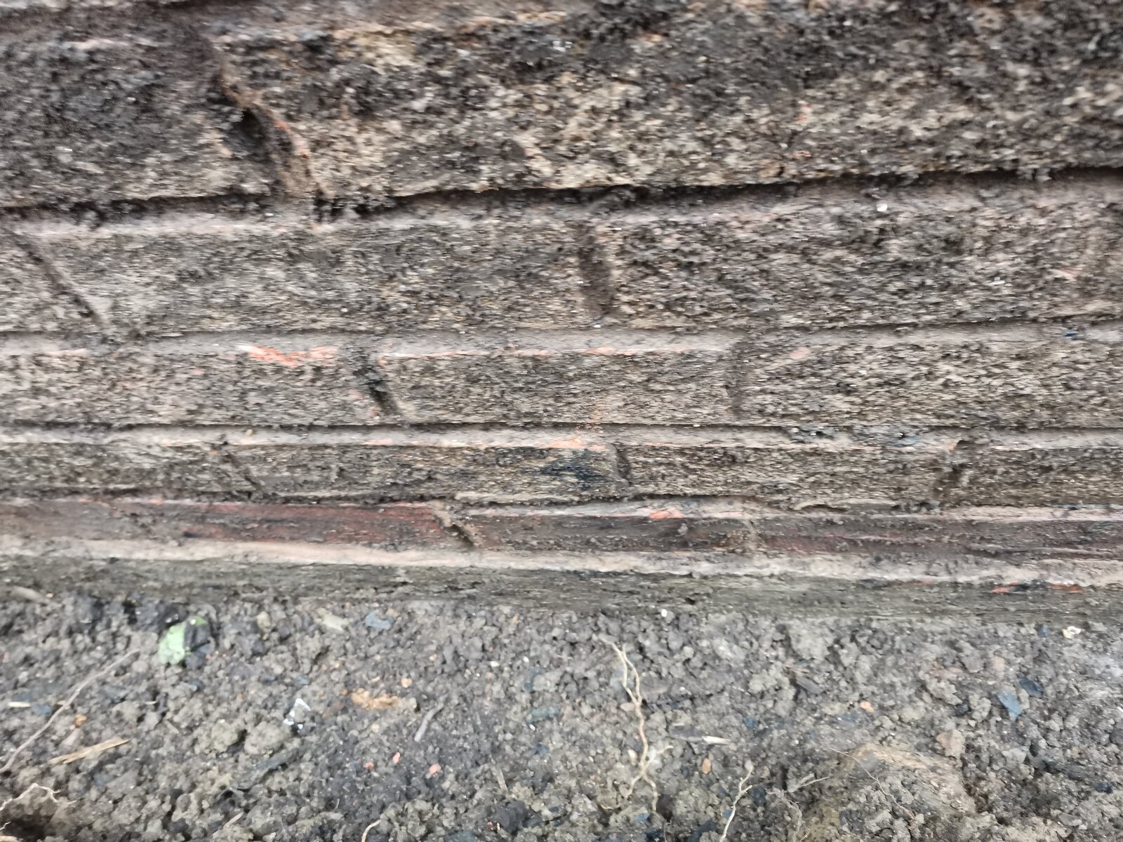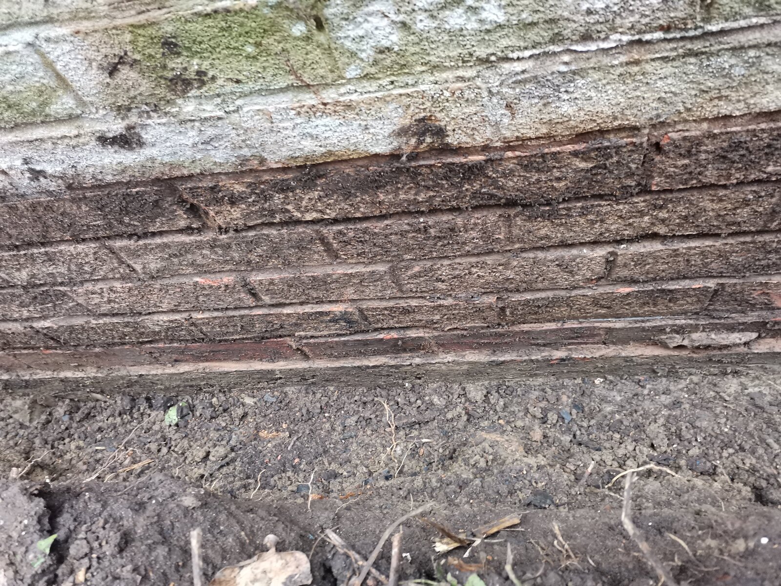From the digging it looked like it wasn't dampproofed as originally when they built the garage they haven't expected to for neighbouring ground to be high. The joint between concrete slab, and brick was sealed with a rubber/felt (?)
