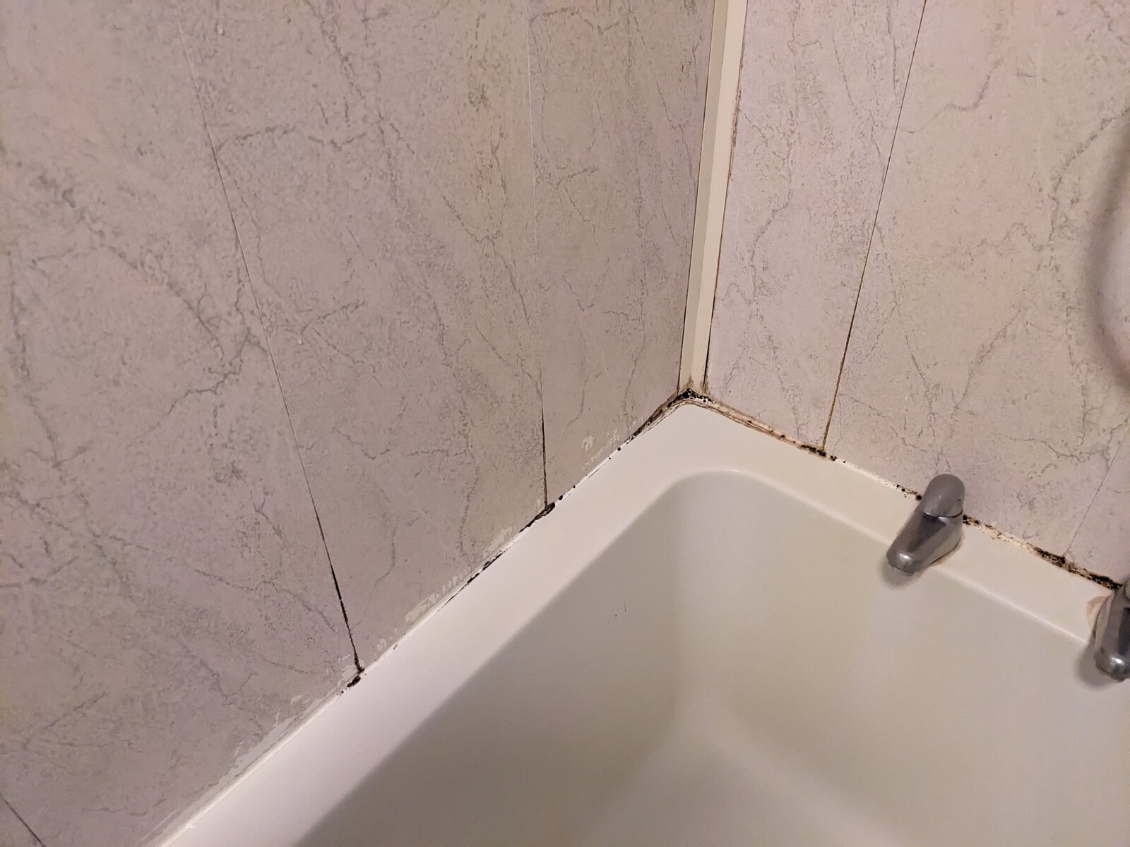 My bath/shower is lined with plastic splashback panels. The sealant around the bath is getting mouldy and it seems like the gaps between the panels are as well (I've attached a picture). I suspect that water is getting inbetween the panels. If that's the case I can remove the existing sealant, run a dehumidifier in the room to dry everything out, and then reapply the sealant, but I assume the issue will just come back as long as water can get inbetween the panels.