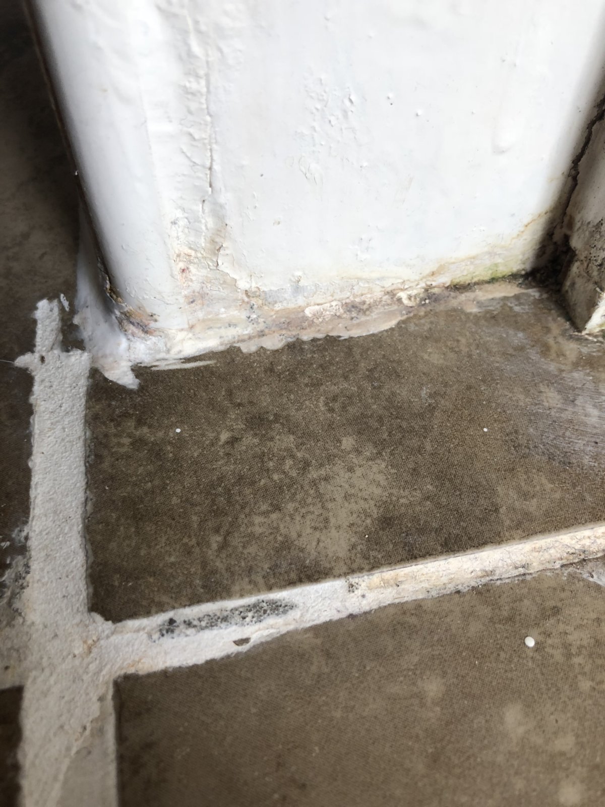 At the base of the frame, there has obviously been some water damage from the splashback of the shower, meaning it has broken away a bit. On the part of the frame inside the room, it looks like the frame was cut to allow for the step up into the room, and two small blocks were added to plug the gap, but one of them has now fallen away (marked in red).