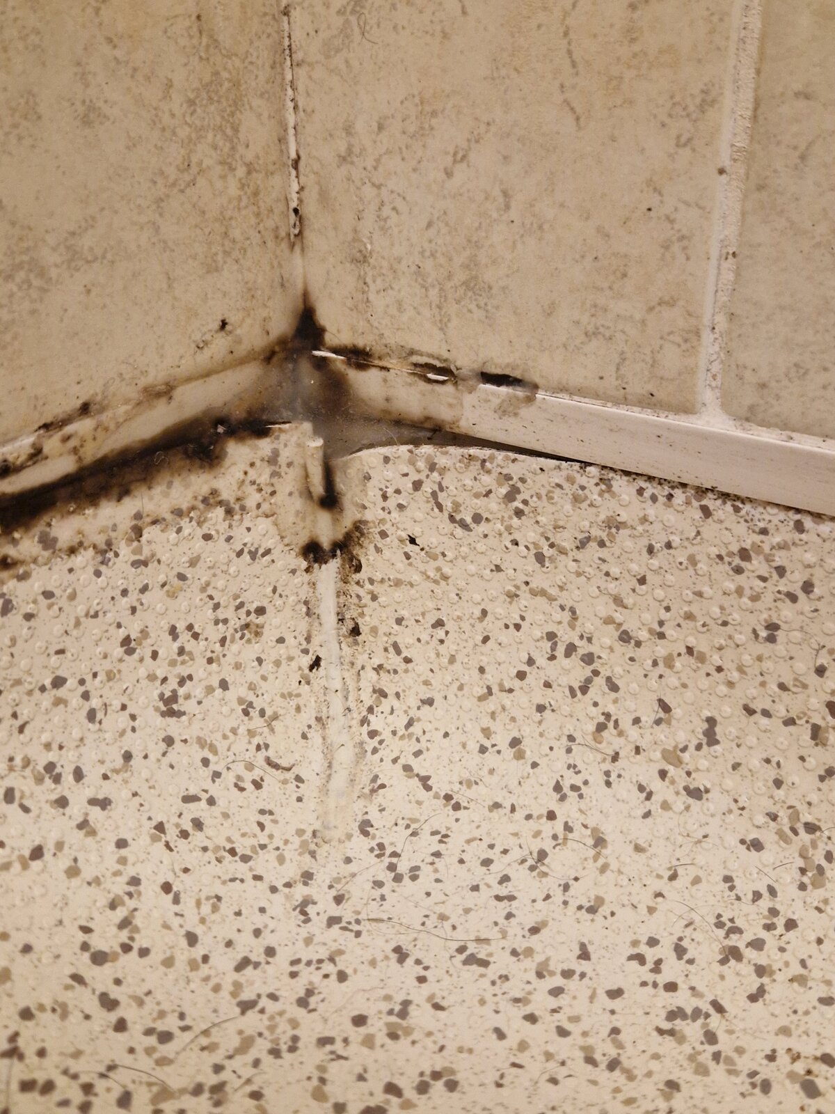 The photo shows mould and clear sealant plugging a gap between the bottom tiles and the flooring.