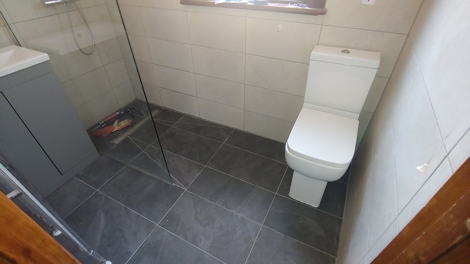 My mum has a wet room that is leaking. The wet room was installed in 2019 by a builder who claimed to be a plumber. The wet room is located on the second floor of a circa 1930s terrace house.