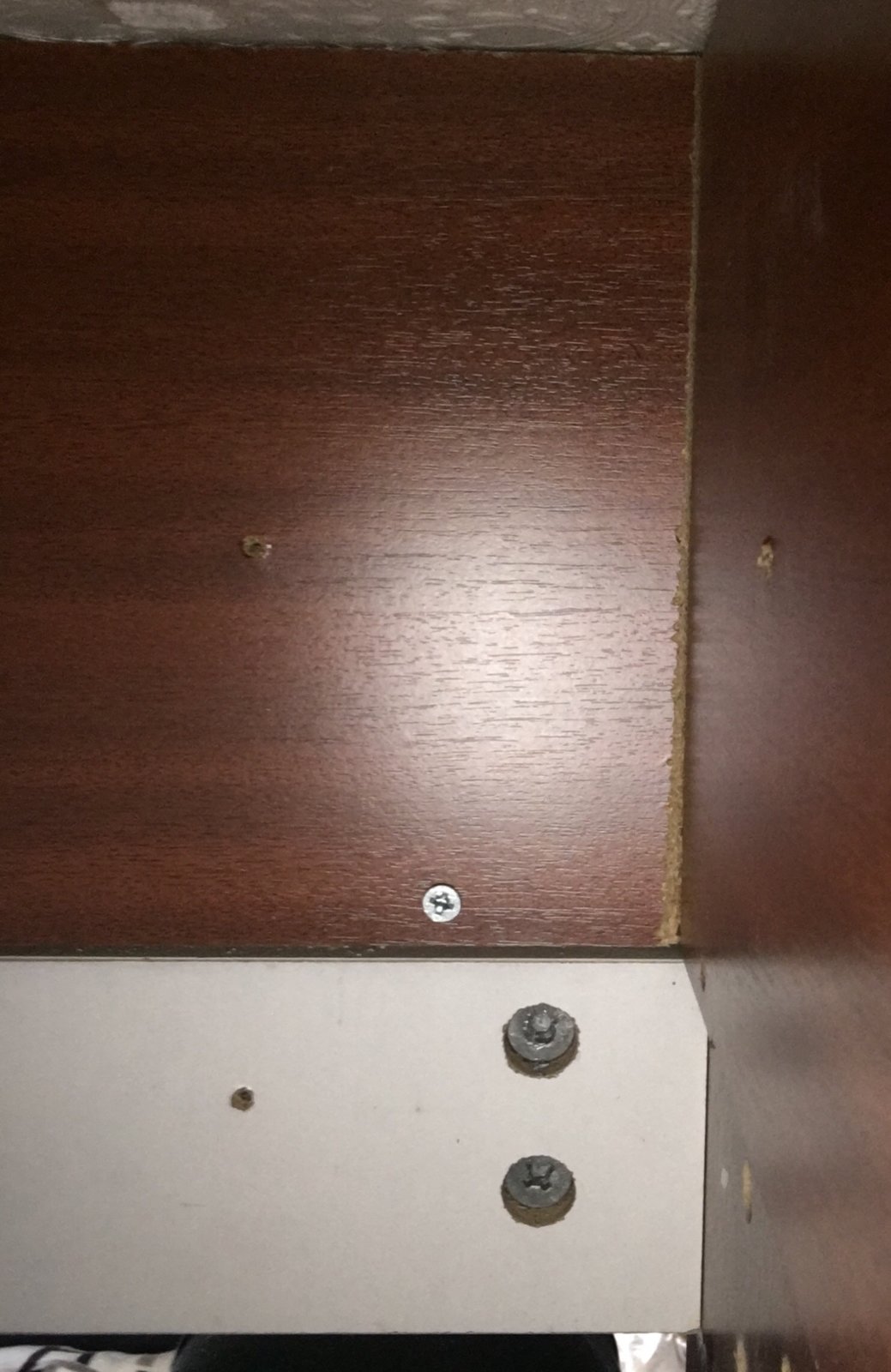 I’m trying to strip down the fitted wardrobe. I’ve found the L-brackets that secure the panels to the wall and floor. There are braces between the vertical panels and they have these large screws as per photo. They remind me of the ones that come with ikea furniture. I’ve managed to round one using my drill.