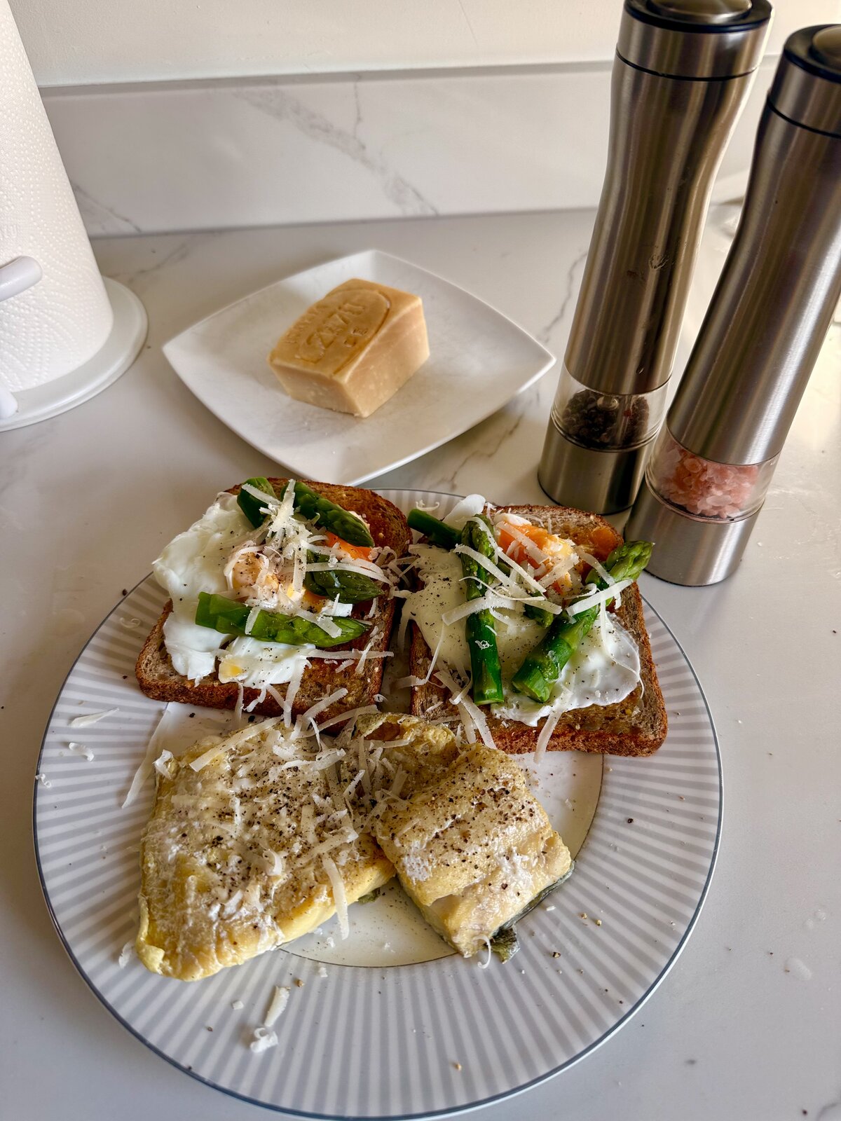 Poached eggs and asparagus tips on toast with a side of milk poached smoked haddock topped with grated 30 month matured Parmigiano Reggiano.