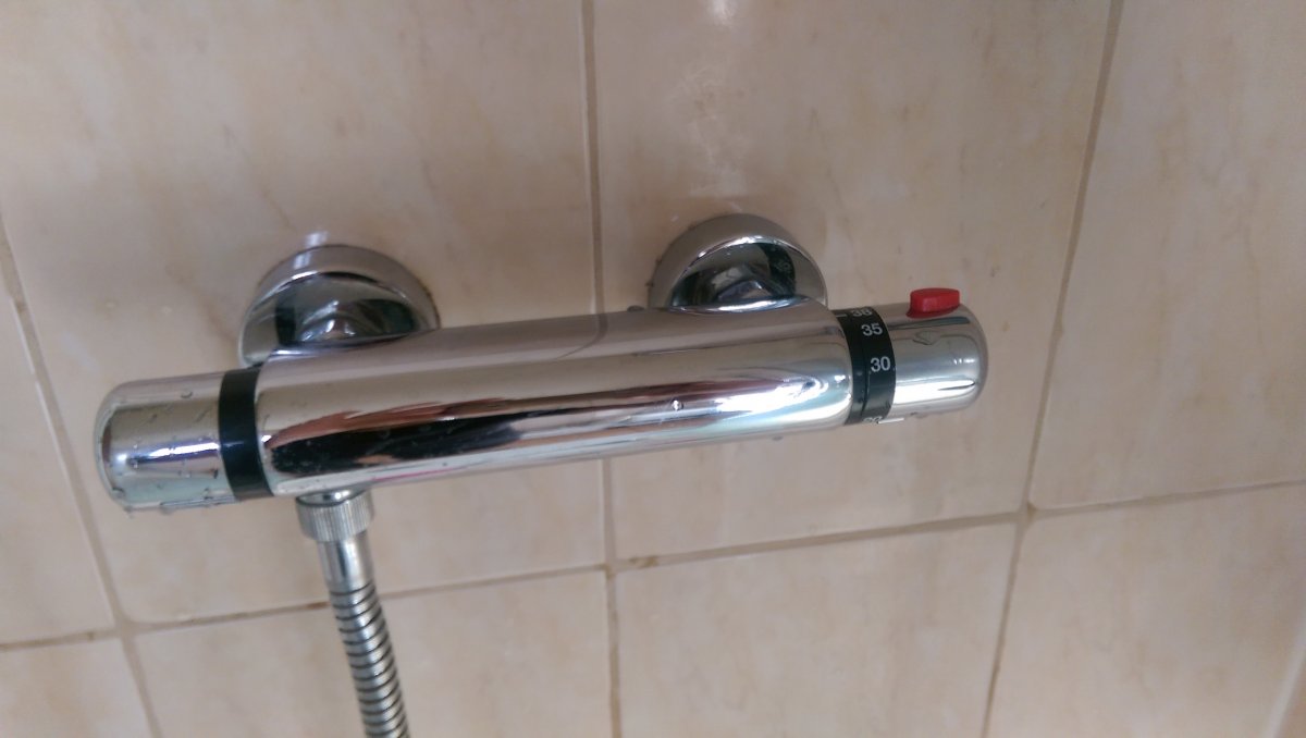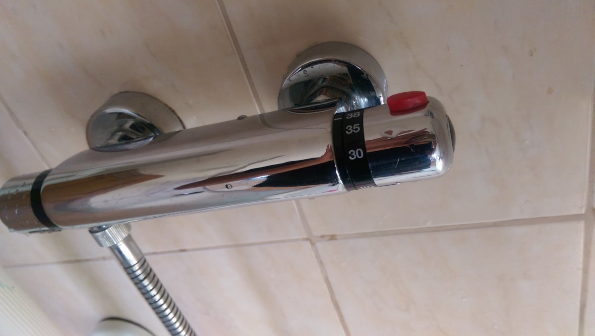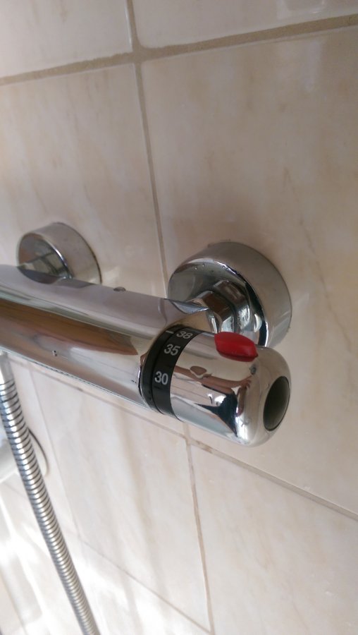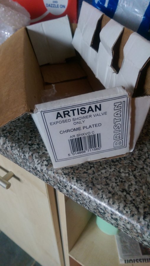 hi got this form ebay, was listed as an artisan thermostatic bar shower, assumed it was made by bristan..anyway got it..came in the box see pics..only bar shower , shrouds and a few pieces with it...feels quite heavy..cant see any bristan branding on it but doesnt seem to be working properly..fitted it no problems just simply remove old one and put this in with new fliters..anyway the cold side side is very hard to turn, because your hands are wet and there doesnt seem to be a good grip that you can get a hold of.. yiu can adjust the temp of water by turning the valve anticlockwise and it is martked 45 degrees up to 50 degree which is quite hot, but i cant seem to turn the valve back down to the preset 38 degree mark..it becomes very stiff and doesnt budge..even when the shower has cooled down after use its difficult to tirn the valve back to 38 degrees as indicated by the red mark...im thinking this is not a bristan shower but something else , just packed into a bristan box. cant seem to find anything simlar with the product code printed on the box..is this genuine or have i been done by a cheap one in a bristan box ?..cheers