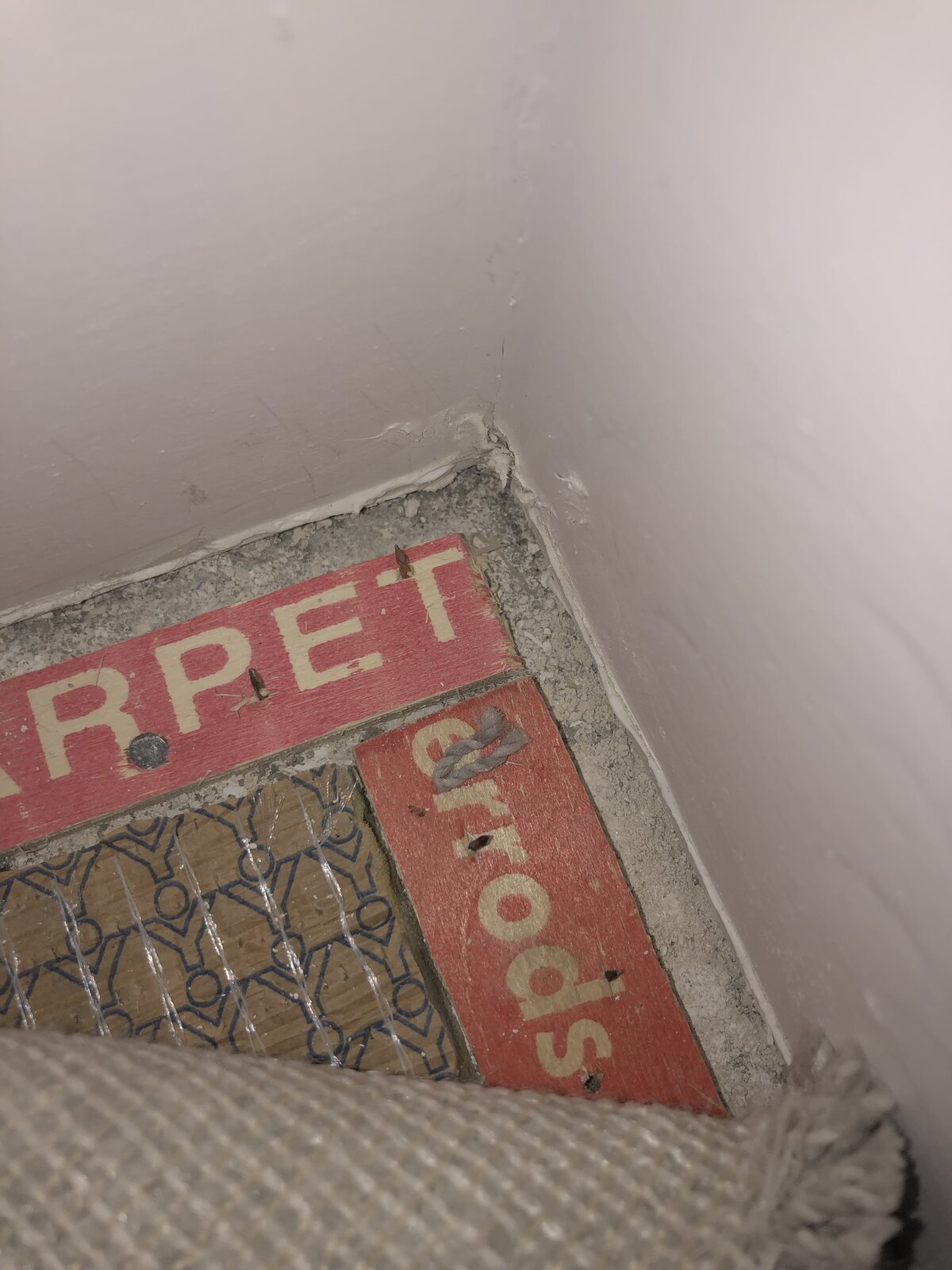Yes that was my plan, batten running across 3 joists. See pic below of carpet grippers nailed to (I think) precast concrete slabs (first floor). My question is, what is supporting these slabs (timber joists?) and can I drill into it from below in the garage?