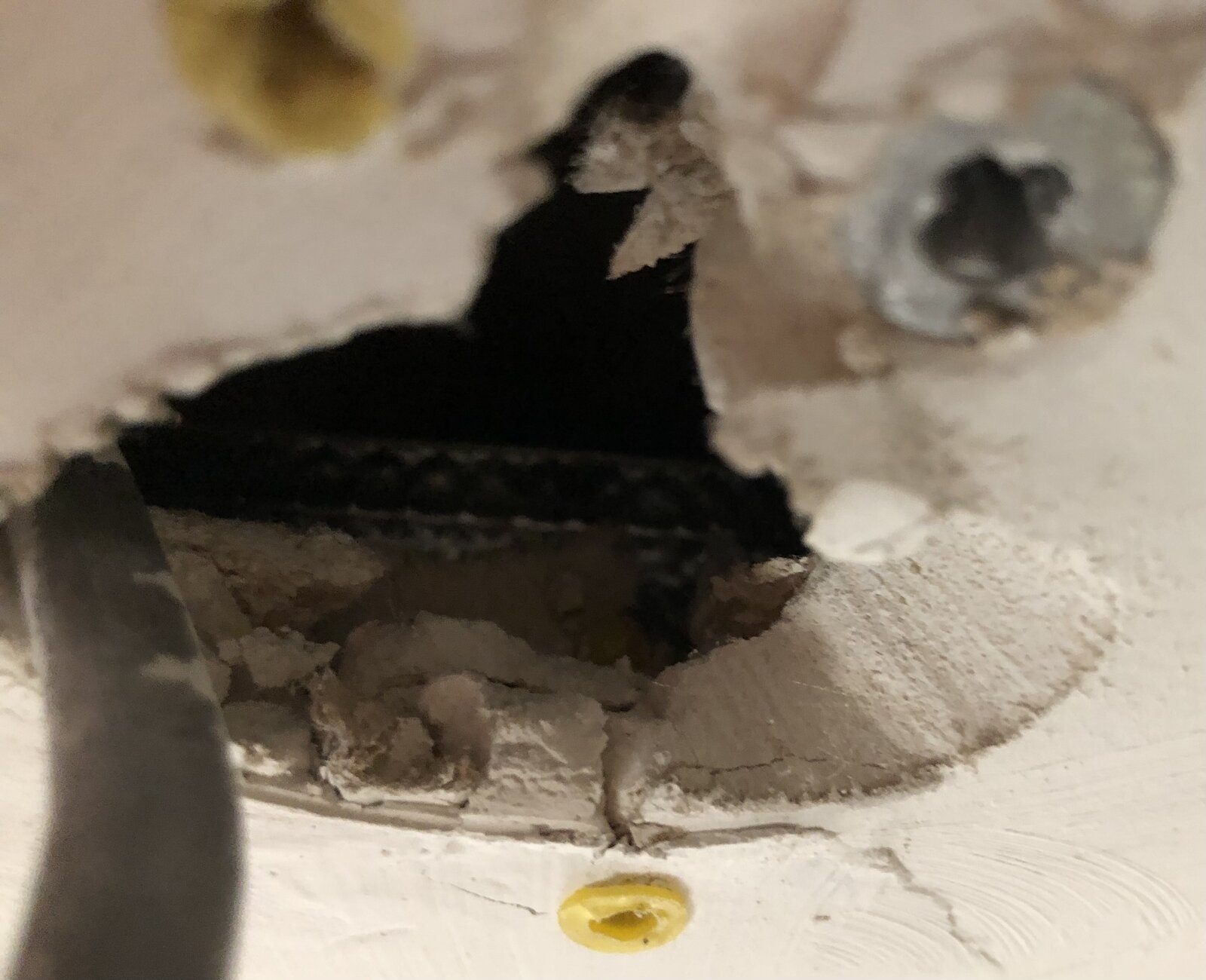 2m60. Below is a pic of what I can see through a light fitting aperture in the hallway next to garage. Again, I’m not at all familiar with concrete floors but at first glance there’s nothing obvious into which to screw battens for bicycle hooks. Happy to be enlightened.How high is the ceiling?