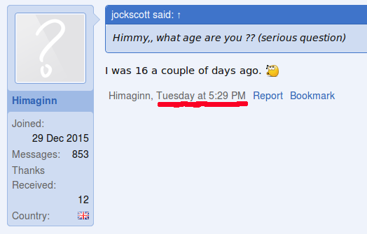 PBC_1966 said: Himaginn said: PBC_1966 said: I thought the inference was pretty clear. Click to expand... What inference? When did I say I was 16? Click to expand... View attachment 94654 That would be Wednesday 1:29 AM your time. Click to expand... What exactly are you inferring? Are you questioning my age? Are you just making nonsense comments?