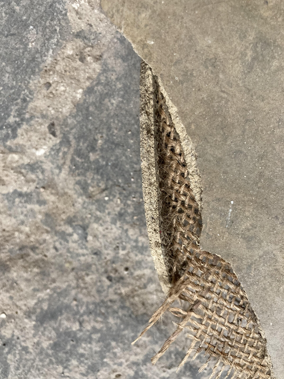 I started to clear out a garage in a Victorian terrace today and have found large sheets placed on the floor to even it out. It’s about 7mm thick and hessian backed. It’s difficult to say what the surface is made of, possibly vinyl or more of a hardboard surface. I'm slightly concerned the internal material contains asbestos as this is quite crumbly but could easily be a type of plaster.