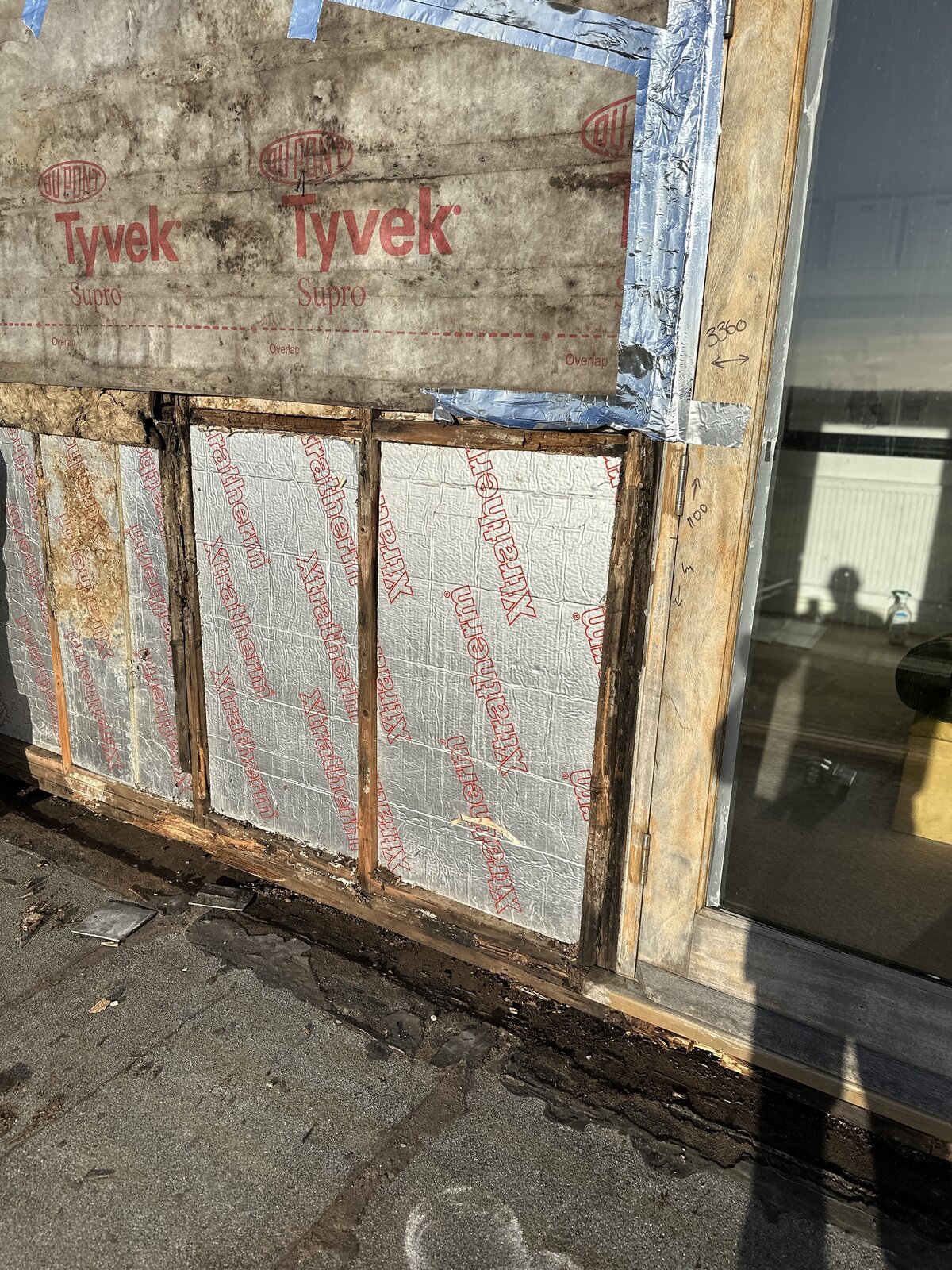 It’s a “lightweight” room built on a flat roof (torch felt). The main wall is exposed to heavy weather. The wall is made up of 2 stacked 5x2s, sat on small blocks of wood and tile in order to be level, then a timber wall, with a French door inserted. The wall is insulated (half with celotex, half with rock-wool), and then clad with OSB. The OSB is covered with tyvek, then battened horizontally, then this was meshed (galvanised) and nailed (galvanised I guess). Then finally rendered.the render is obviously very different thicknesses and the whole mesh has rotted as have the fixings. Meaning the render is “floating”. The OSB boards are stained at best, dust at worst. As is the first 1” of the timber r]frame (from outside-in). The stacked tx2’s resemble a sponges most of there lengths.