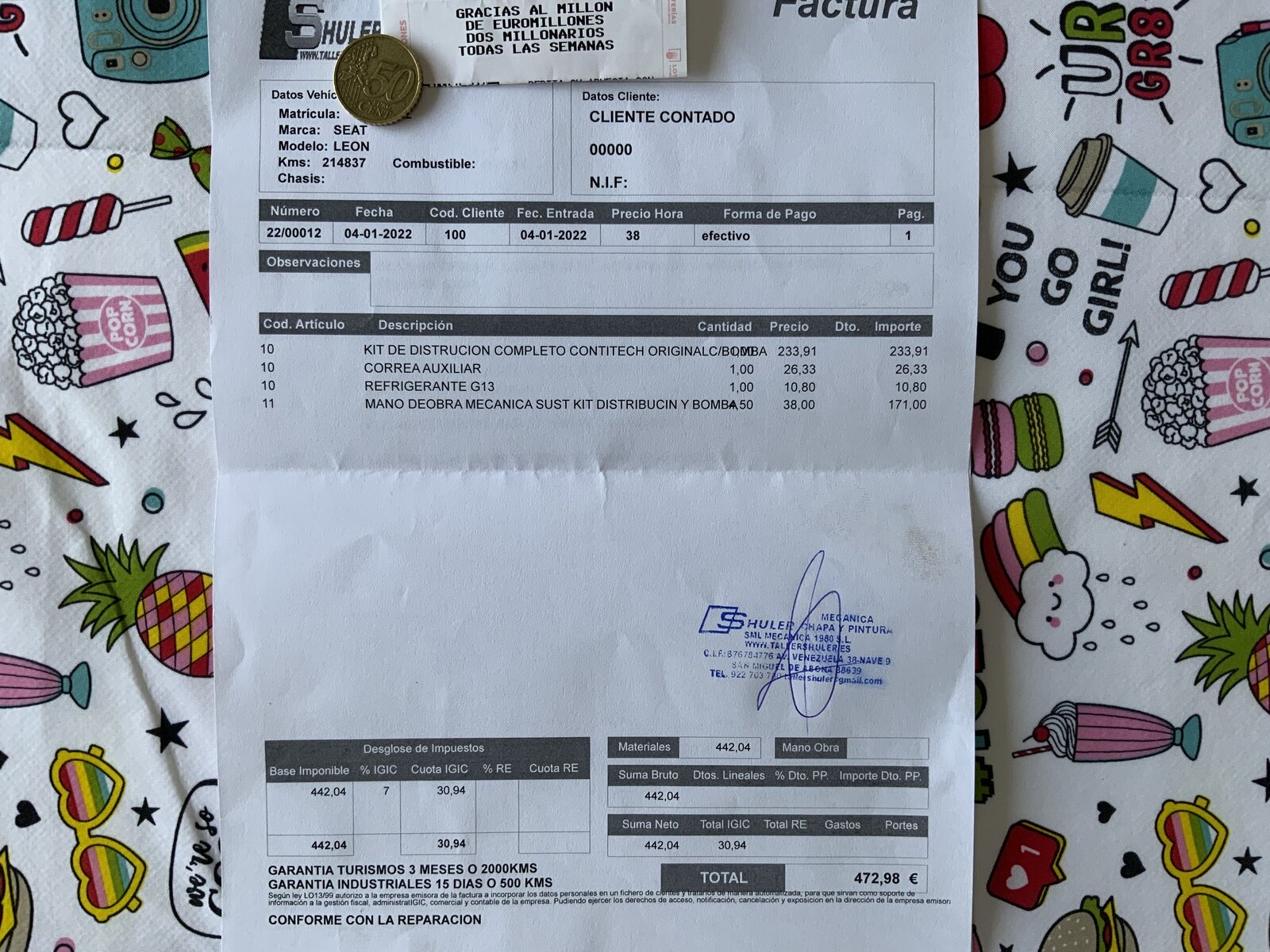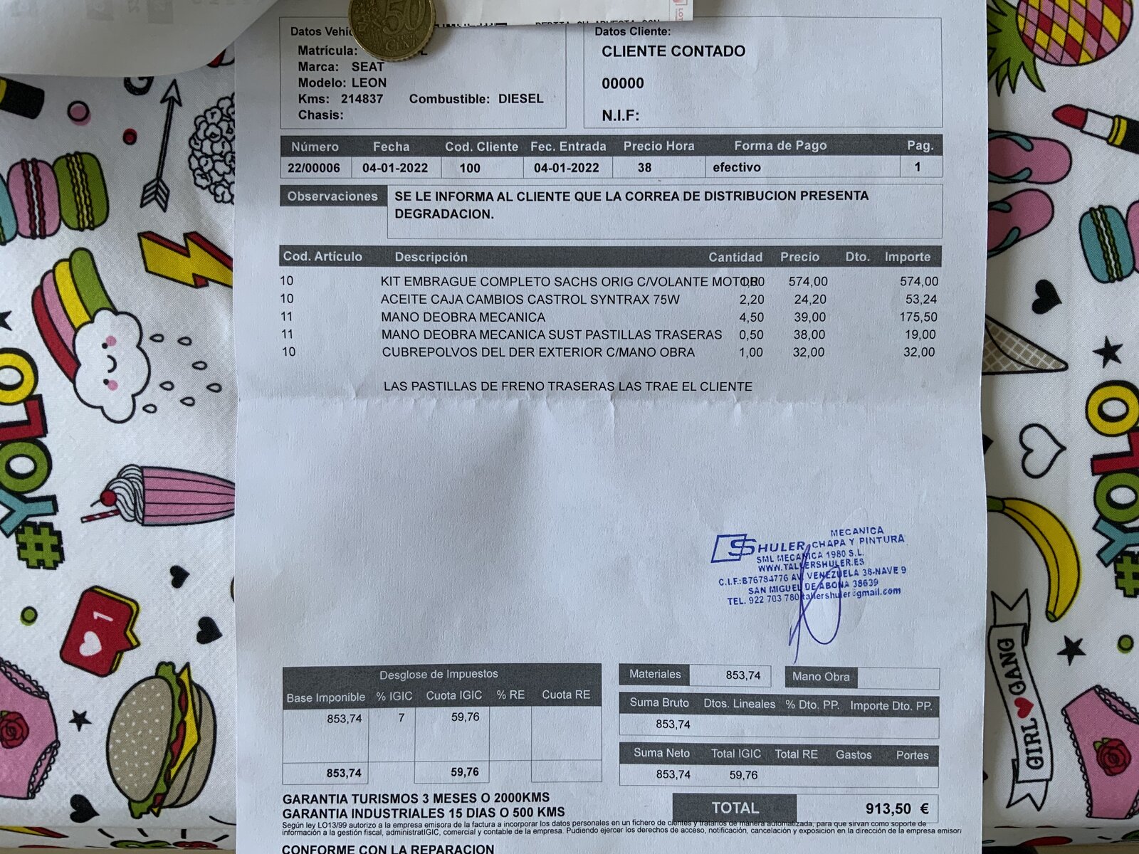 It’s a lot less than the dealer and they also fitted a new drive shaft boot (cubrepolvo/dust cover) and a set of rear pads that I had in the boot with the intention of fitting.