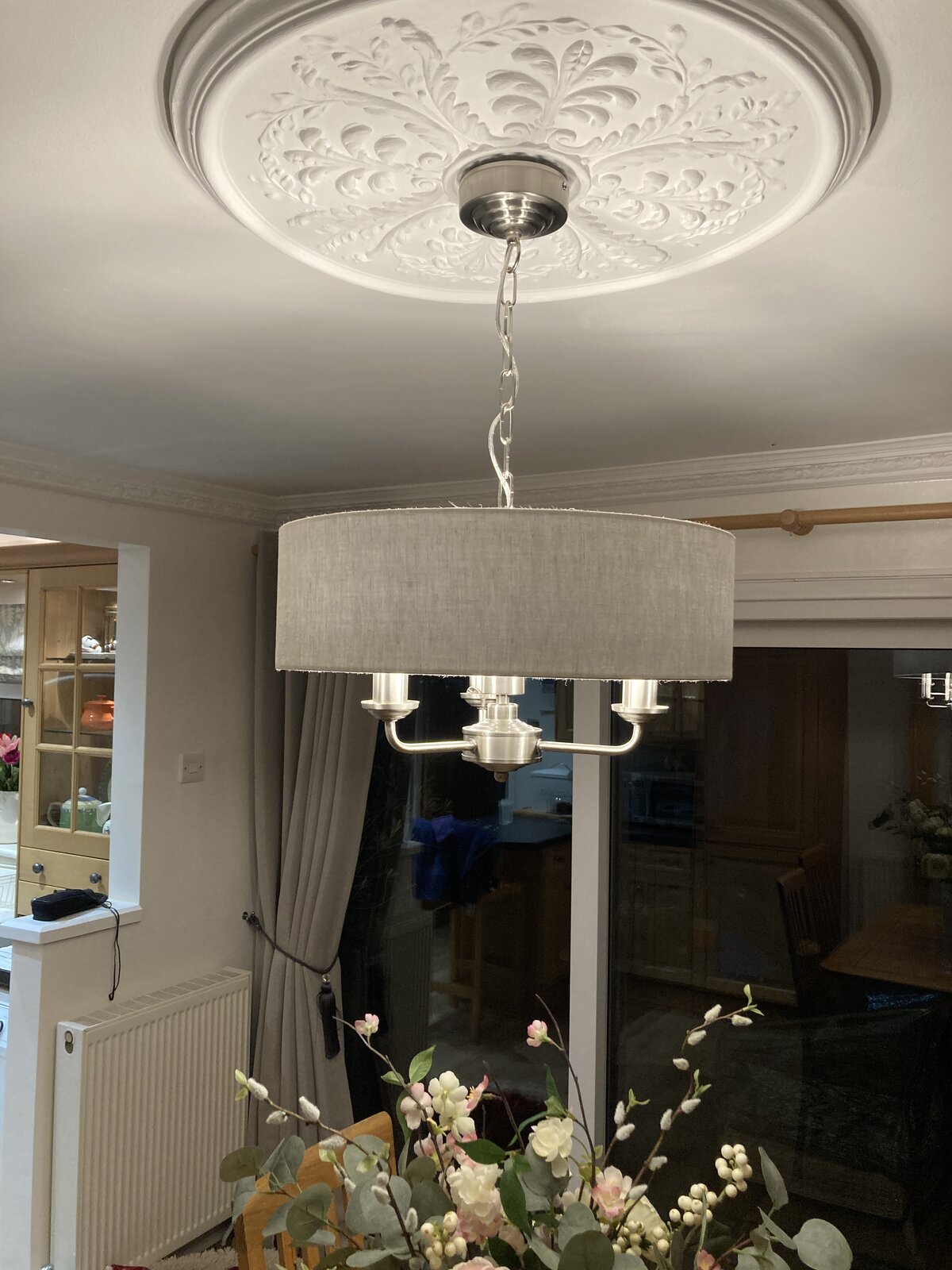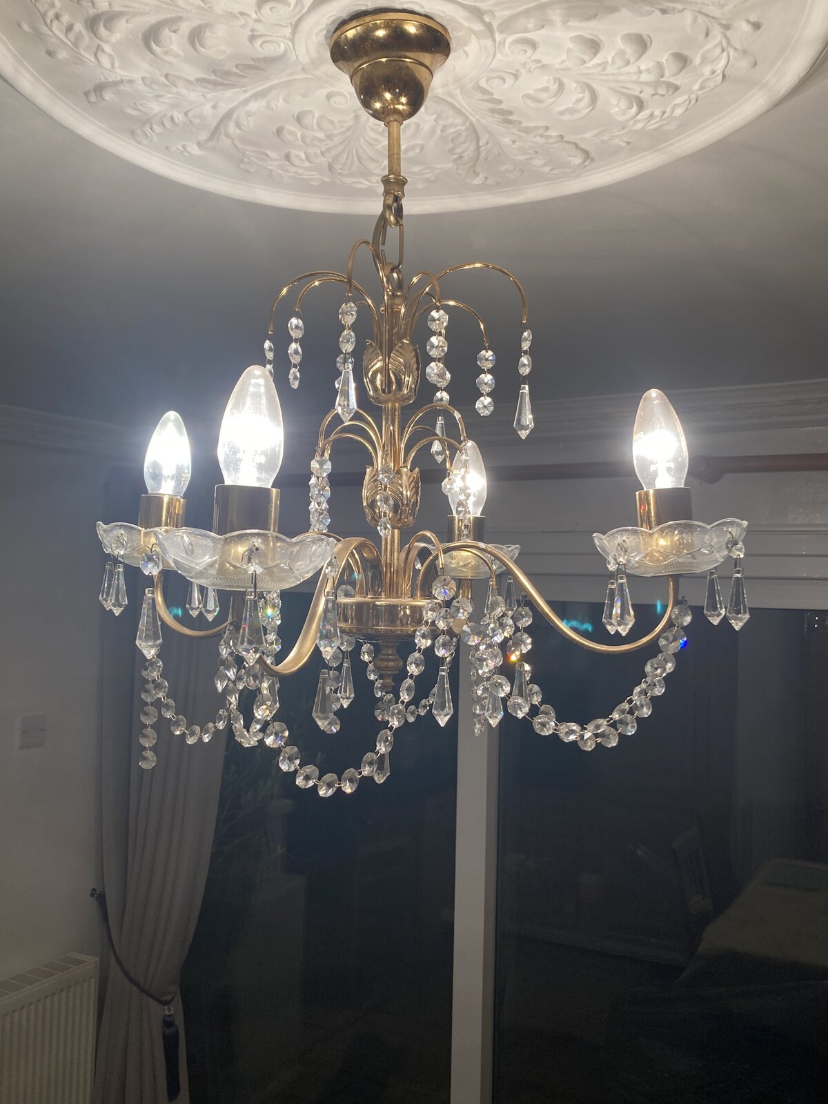 I was bored so I got on with fitting the new lamp. Bit sad to see the old lamp come down. We have a pair of them and we bought them in 1984 when we got our first house. Cost a small fortune back then - £250 each seems to ring a bell - gold plated Swarovski Crystal. I had to sit in the back of my van holding them while mrs Mottie drove us home - slowly! Our friends liked them so much they went out and bought a pair of them too and theirs are still going strong in their house in East Ham. We brought ours with us when we moved here in 1990 and they have been up ever since (had to take all of the chain off of it because the ceilings in this house are a lot lower than the Victorian one we moved out of).I might get round to fitting the new lamp that arrived yesterday but I’ll probably get the chain length wrong so I might as well wait for the site foreperson to get home….