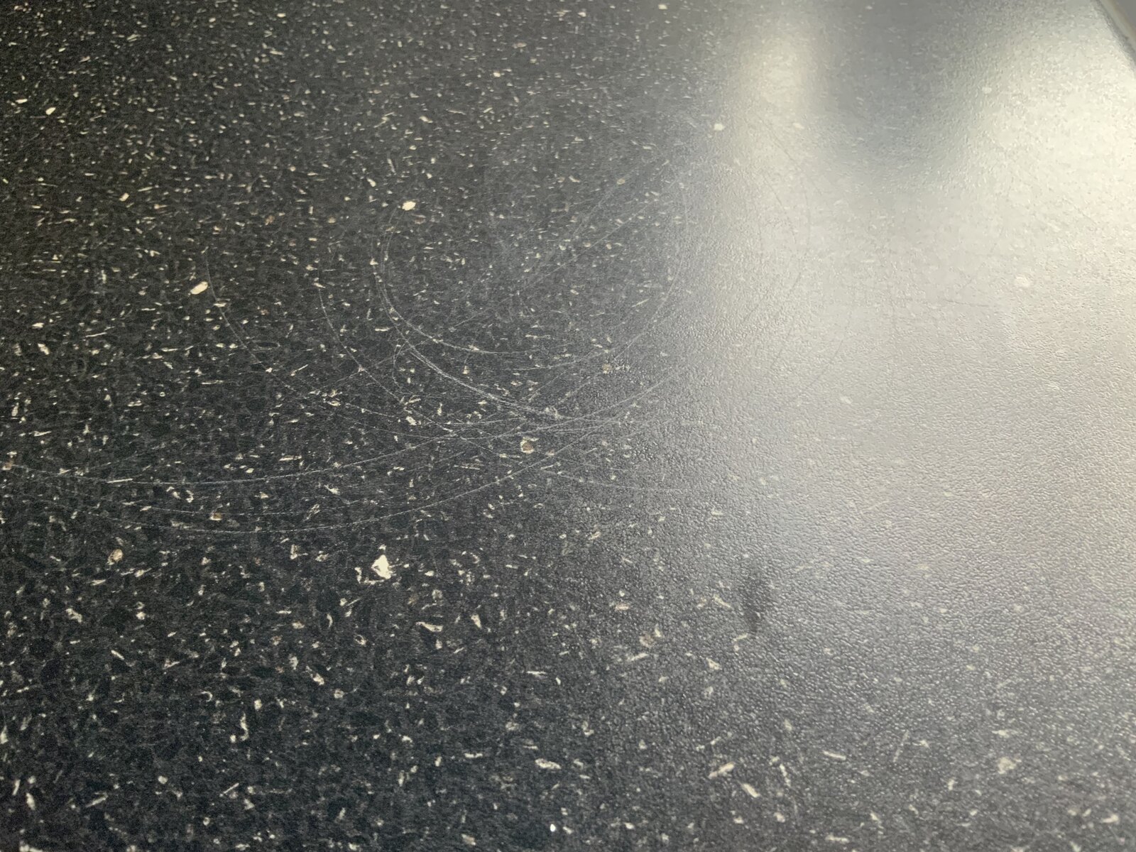 I wonder would a gentle plastic polish (like Grey Gate polish) get those scratches out…Fecked my worktop up today.Made myself an espresso, popped a half cube of Demerara sugar in it and instead of stirring it with a spoon, I stood looking out of the window at a wood pigeon on my grass while swirling the espresso cup on the worktop to stir the sugar up. Didn’t realise the damage I did. Now it’s given Mrs Mottie ideas about changing the worktops. And the units. And and and. All because of a cup of coffee. Can this be repaired?
