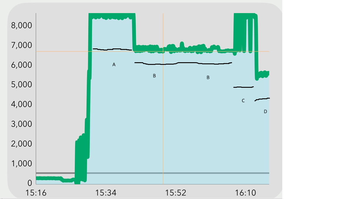 A is everything powered up, including the washer, whilst washer is heating the water, for around 12minutes. B is the ripple, from the washer cycling during the wash. C doing a second wash, which is a larger wash of heavy curtains, plus the immersion heater in the cylinder cycling on and off. D is the immersion heater finally switching off, and the washer up to temperature, doing it's wash cycle.