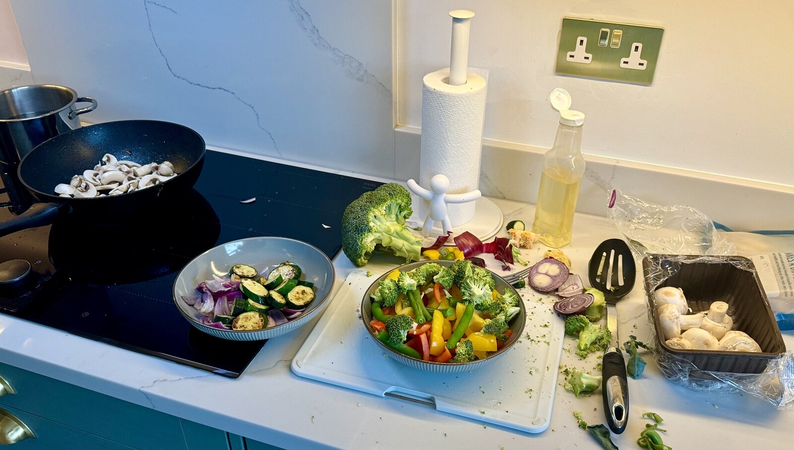 Dunno if there’s a name for it but we are having what we call “pasta mash up". Basically, stir fry any veg you have left over - tonight I fried red onion, courgette, red and yellow peppers, garlic, mushrooms, French beans and broccoli.