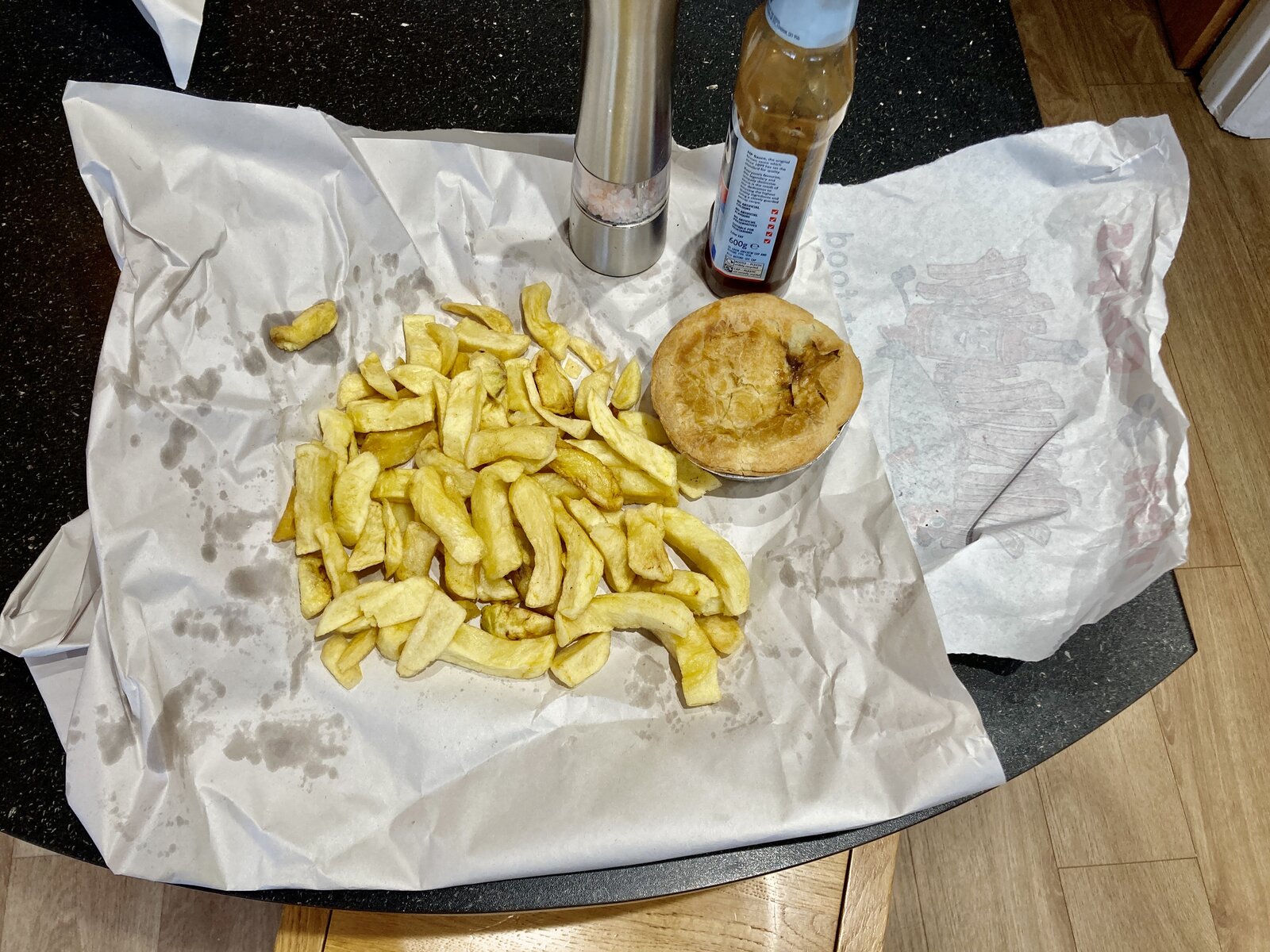 That’s a bit steep for pie and chips!Mrs Mottie is on late childminding duties so it’s pie 'n' Chips for me. No plate. No cutlery. Brown sauce. Hot meat and sauce down my shirt. £6.80 which I thought was a bit expensive.