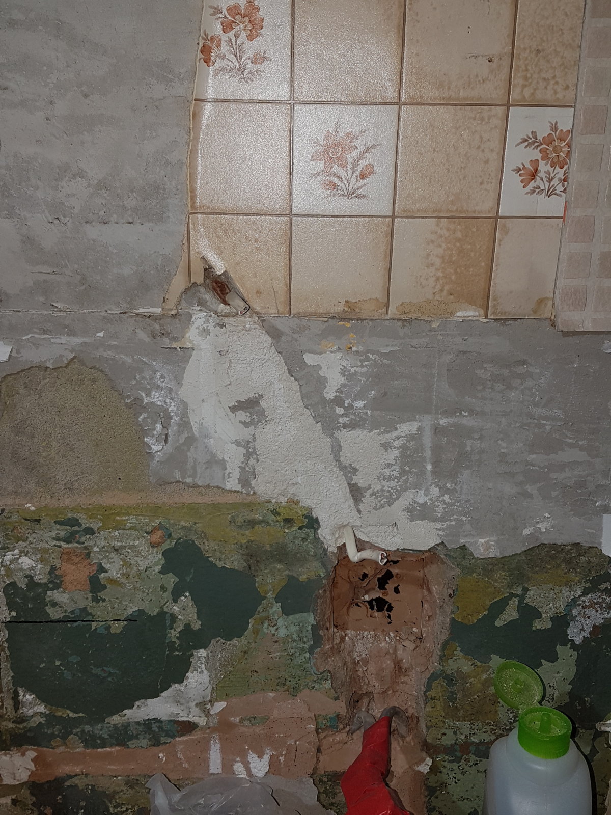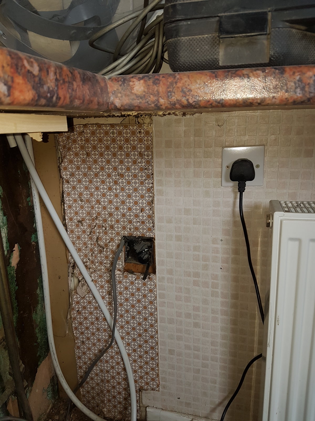 I was also interested to see that the supply to the under cabinet lights ran at 45 degrees from the fuse switched spur unit (I removed it) and it had a 13a fuse. The connector wrapped in red tape is so I can still use the washing machine and all the wiring will be replaced.