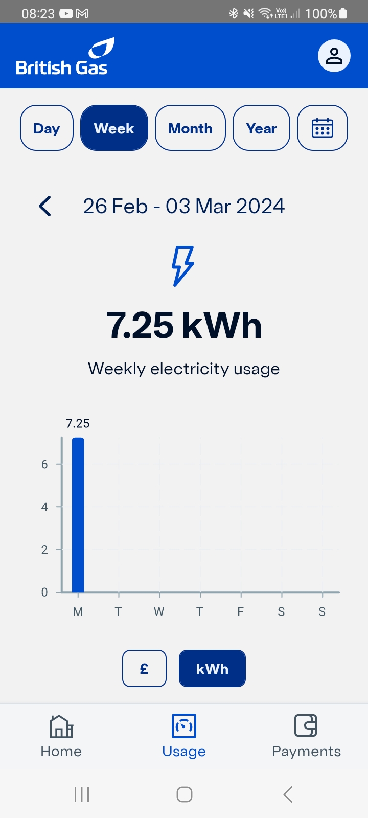 is the latest reading with the app. 26th Feb 2024 is before I changed tariff, and before the solar software was set to charge battery over night. 7.25 - 6.32 = 0.93 kWh at the higher rate of 31.31p which is 29p and 6.32 at the lower rate of 8.95p so 56.5p so standing charge 59.14 + 29 + 56.5 = £1.44 a day looking back to before tariff change shows