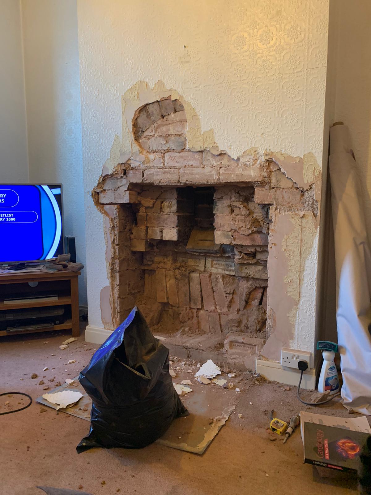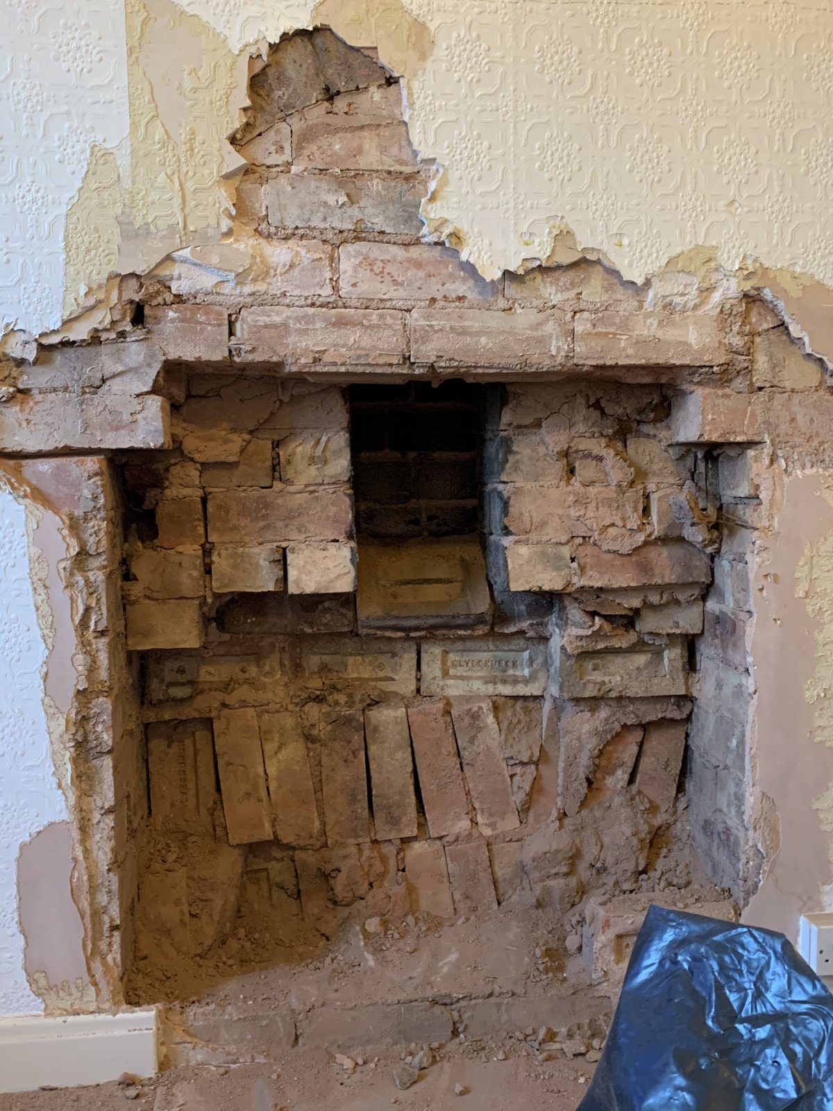 We are in the process of opening up our fireplace in our 1930’s semi, we have a large arch higher up the wall, so need to install a lintel lower down for the new opening. However, when taking out the builders rubble we have found some very messy and disorganised brickwork we would like to remove, but are concerned it may be supporting the flue, as we can’t actually see what is holding it up, however, it looks like it was put in at a later date as the bricks are different?