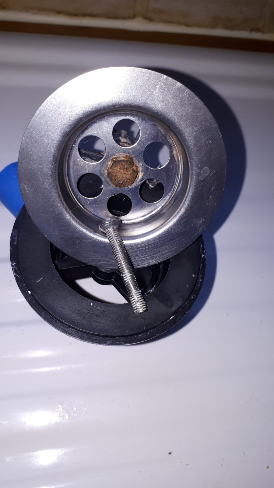 Need to replace sink drain plug (due to leak), bought new kit, but screw is to short. As you see in this image previous person has used a bolt.