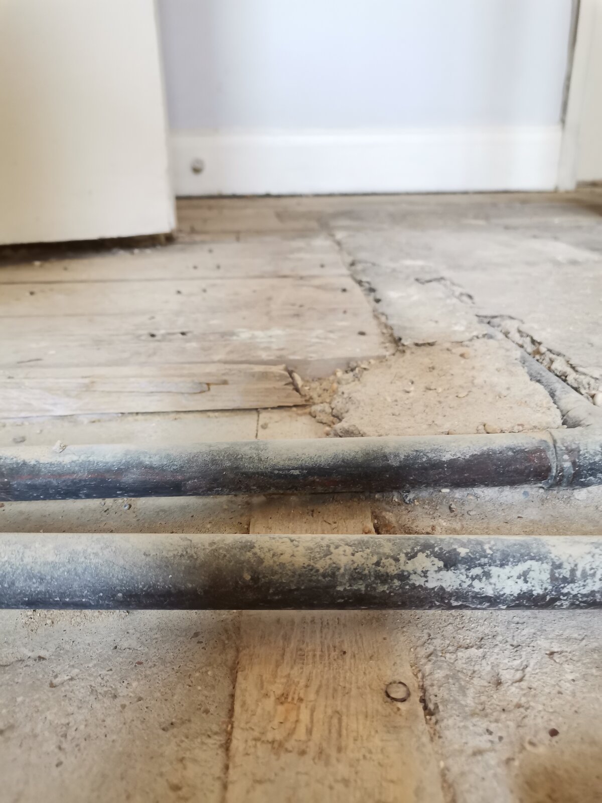 My flat was built without central heating, and at some point someone decided it'd be a good idea to completely ruin a nice set of floorboards by carving a big concrete monstrosity down the middle of them to carry hot water pipes - pictures attached.