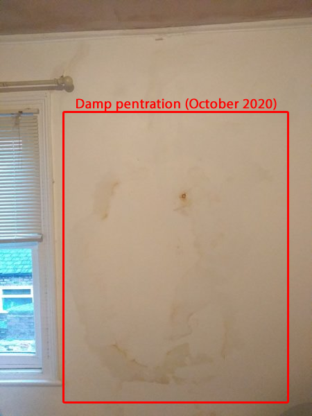 - Photo #1 "BedroomDamp". The back bedroom wall was showing obvious penetrating damp. This was ongoing for about 1 year (roughly since Oct 2019)
