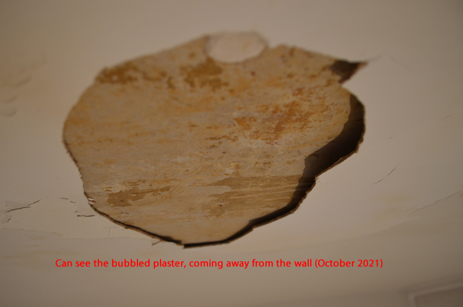 - Photo #5+6 "Oct 2021 Loosened plaster"/"Oct 2021 Bubbled plaster". The paint appeared to have bubbled, or more so the case that the plaster has loosened from the wall and was soft to the touch.
