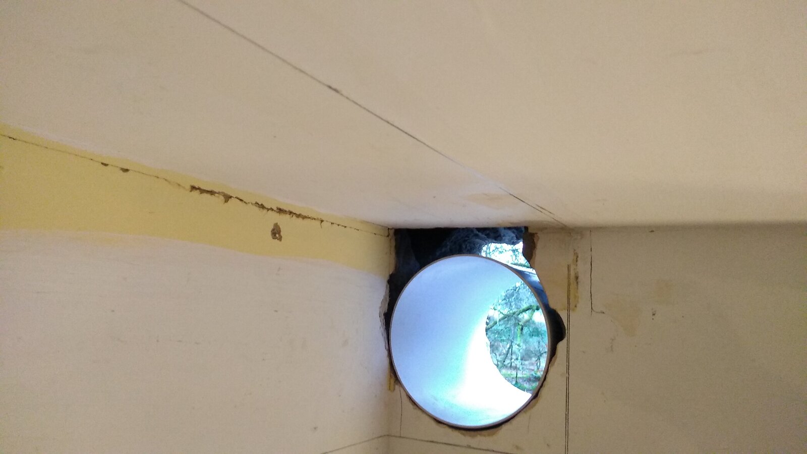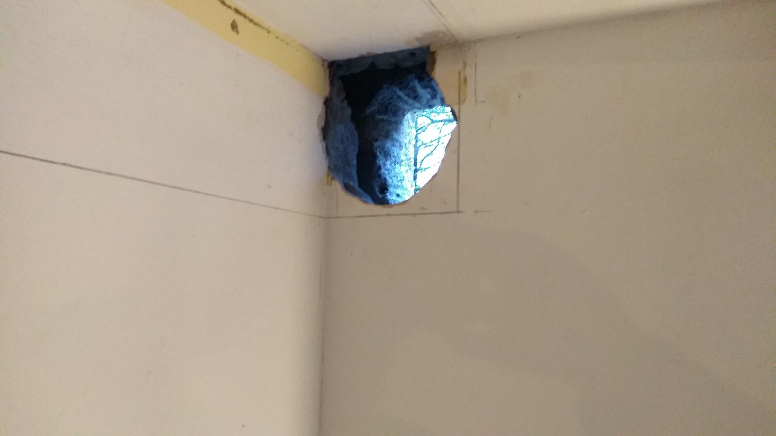 I'm in the middle of putting up a kitchen extractor. The cooker is on an internal wall, so the ducting takes a right hand turn above the hood and runs for a meter and a half or so to the nearest outside wall. The previous hood had small rectangular ducting that exited bang in the corner there the two walls and ceiling meet. The new ducting is round and much larger at 6"/150mm diameter.